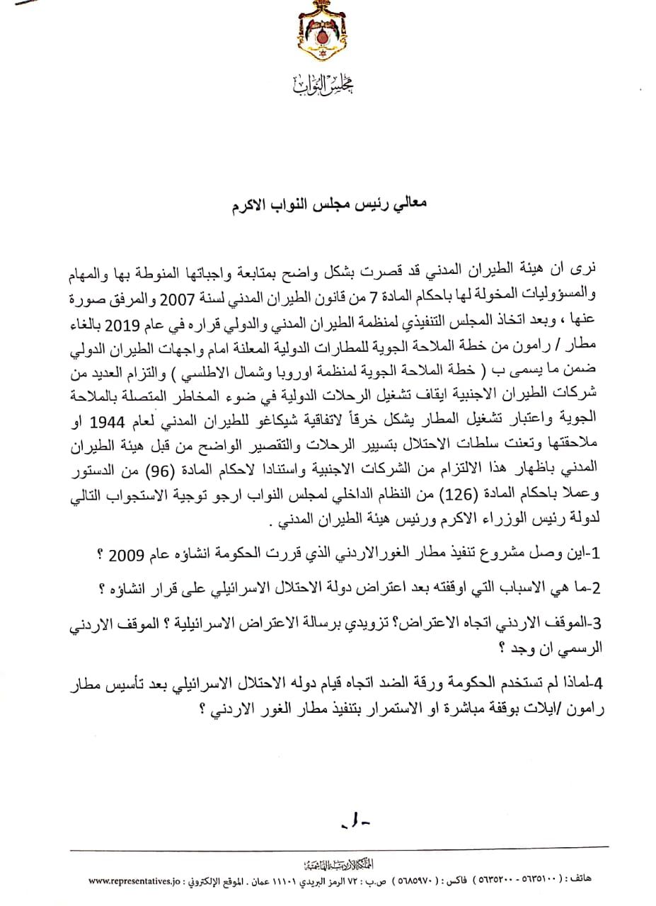 4-لماذا لم تستخدم الحكومة ورقة الضد اتجاه قيام دوله الاحتلال الاسرائيلي بعد تأسيس مطار رامون /ايلات بوقفة مباشرة او الاستمرار بتنفيذ مطار الغور الاردني ؟