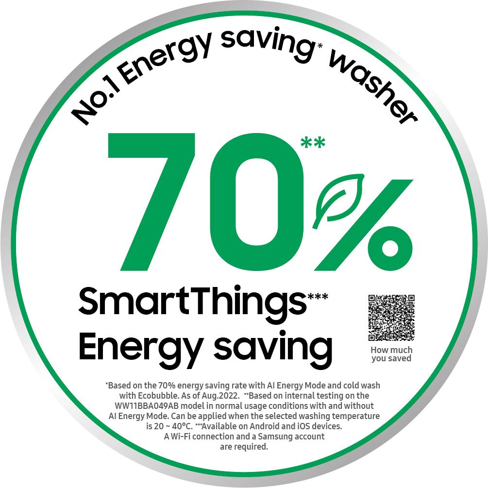 وبالنسبة إلى غسالات سامسونج المصنفة رقم 1 من حيث كفاءة الطاقة، تعمل خاصية SmartThings Energy مع نسق AI Energy Mode على تحسين دورات الغسيل، باستخدام تقنيات مثل AI Ecobubble التي تقلل معدل استهلاك الطاقة بنسبة تصل إلى 70%، وذلك عن طريق غسل الملابس بالماء البارد مع توفير تنظيف قوي.