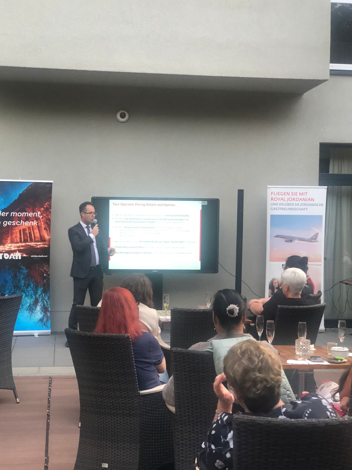 ومثل هيئة تنشيط السياحة ضمن الوفد الأردني المشارك في الفعالية مساعد مدير دائرة التسويق في هيئة تنشيط السياحة ومدير التسويق الإقليمي ، ومن الملكية الأردنية رئيس الدائرة التجارية كريم مخلوف، وخلال الفعالية، قام ممثلي الهيئة والملكية الأردنية بعمل عرض تقديمي بتسليط الضوء على أهمية السوق الألماني بالنسبة للأردن، والتأكيد على الدعم المستمر المقدم من قبل الهيئة والملكية الاردنية، سواء من خلال الحملات التسويقية المشتركة أو برنامج الدعم التحفيزي المخصص لشركات السياحة بالإضافة الى برنامج دعم الطيران العارض ، بالإضافة إلى الدعم المقدم للملكية الأردنية من قبل هيئة تنشيط السياحة.