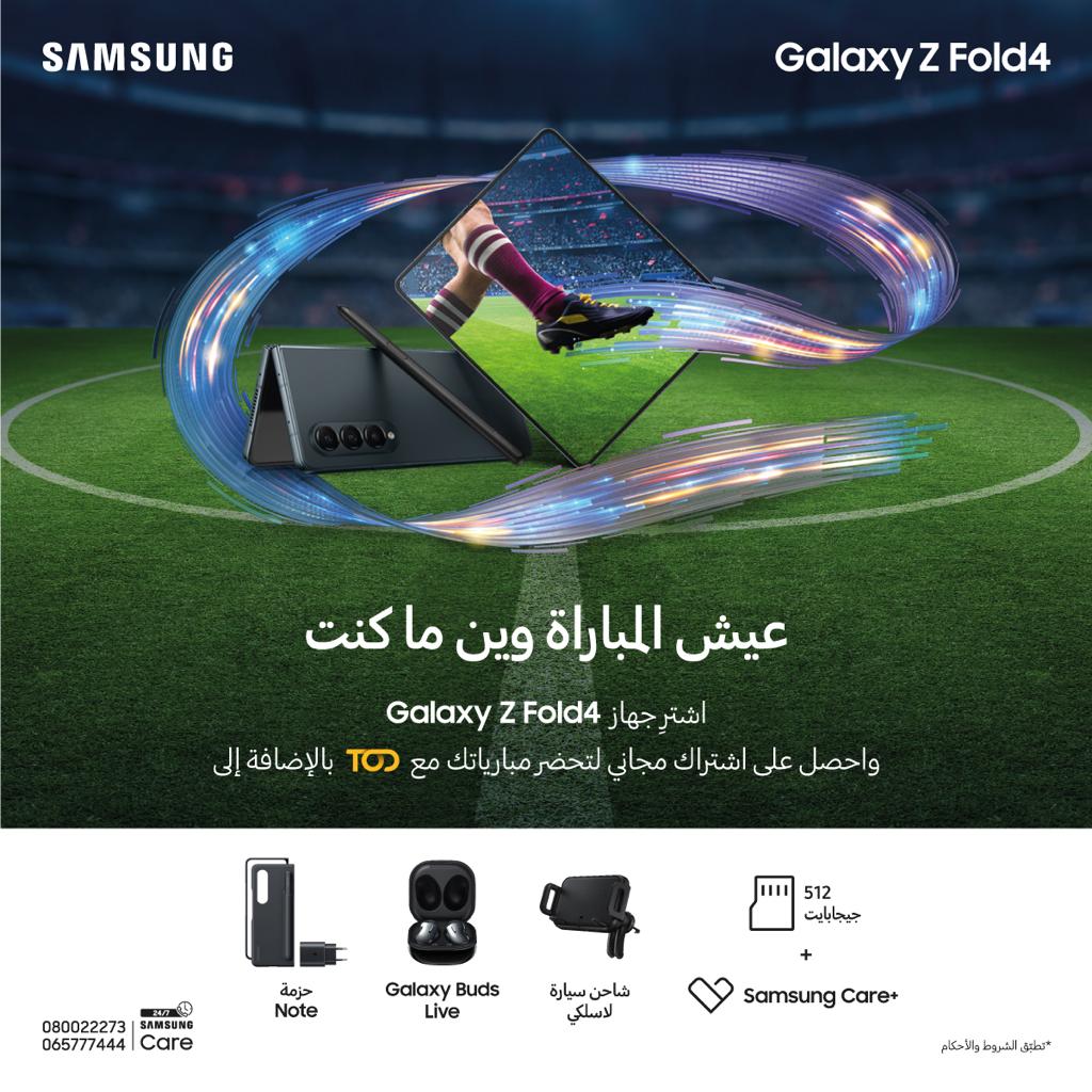 هذا وسيحصل كل من يقوم بشراء هاتف Galaxy Z Fold 4 من أي من معارض وموزعي ووكلاء سامسونج الرسميين في المملكة، على حزمة مكونة من سماعة Galaxy Buds Live، وغطاء هاتف يحتوي على قلم سامسونج S Pen، وشاحن سيارة لاسلكي متنقل، بالإضافة إلى اشتراك مجاني سيستمر حتى نهاية موسم كرة القدم في منصة البث TOD عبر تطبيق Samsung Members. أما مشتري هاتف Galaxy Z Flip 4 على حزمة مكونة من سماعة Galaxy Buds Live، وغطاء سيليكون للحماية، بالإضافة إلى شاحن سيارة متنقل بقوة 40 واط، بالإضافة إلى اشتراك مجاني سيستمر حتى نهاية موسم كرة القدم في منصة البث TOD عبر تطبيق Samsung Members.