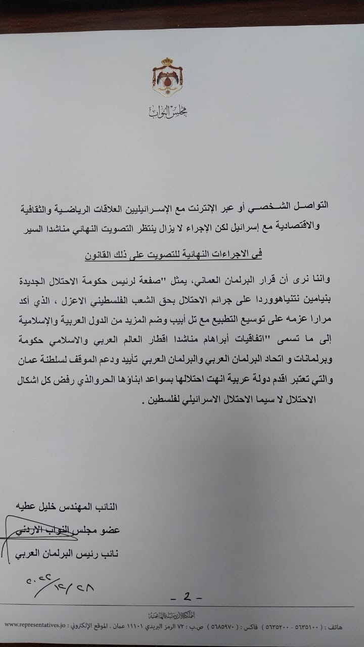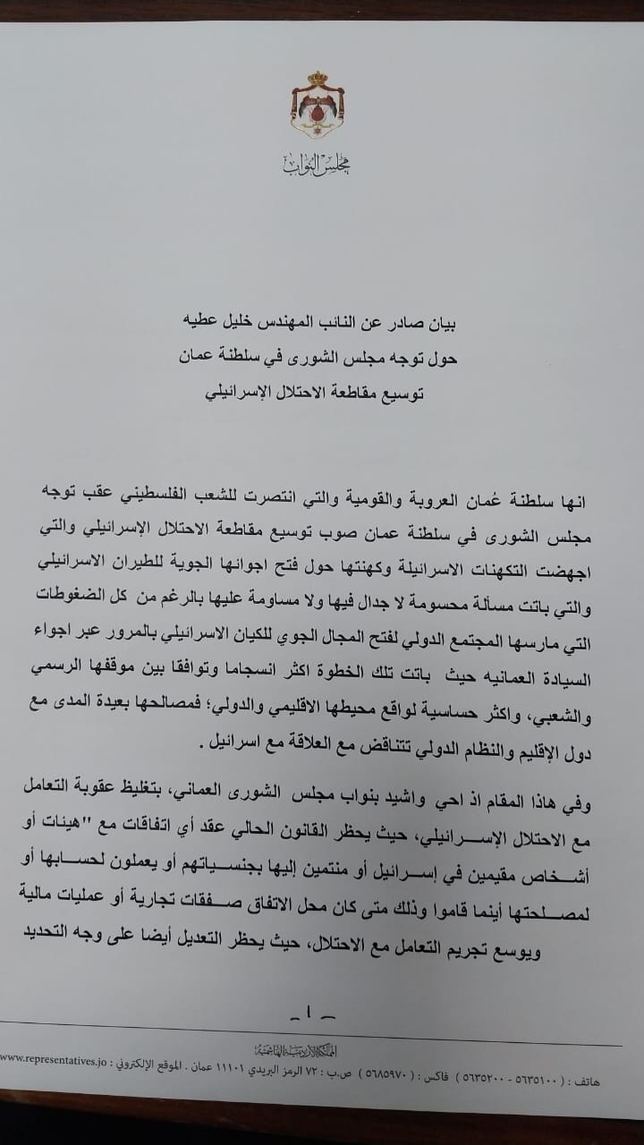 بيان صادر عن النائب المهندس خليل عطيه حول توجه مجلس الشورى في سلطنة عمان توسيع مقاطعة الاحتلال الإسرائيلي.. وثيقه