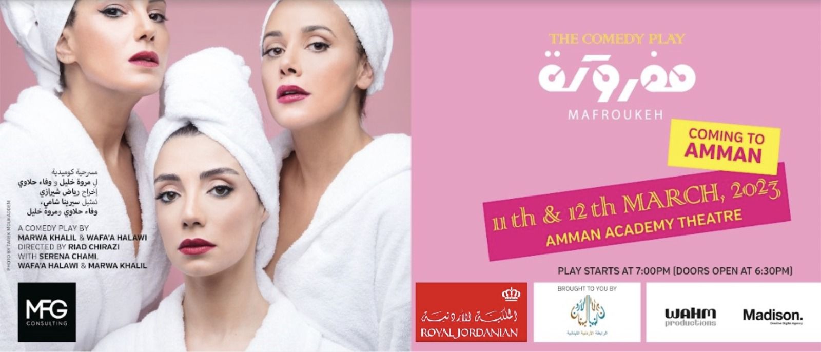 بالإضافة الى اقامة مسرحية مفروكة يومي السبت والأحد الموافق 2023/ 03/ 12-11 في تمام الساعة السابعة مساء في مسرح أكاديمية عمان.