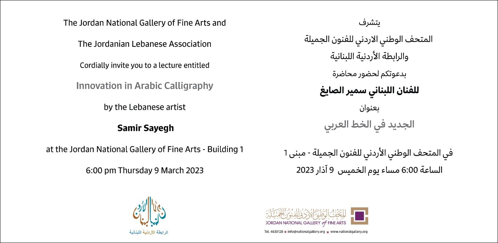 كما تشتمل على اقامة محاضرة للفنان سمير الصايغ بعنوان (الجديد في الخط العربي) يوم الخميس الموافق 2023/03/9 في تمام الساعة السادسة في المتحف الوطني الأردني للفنون الجميلة في جبل اللويبدة.