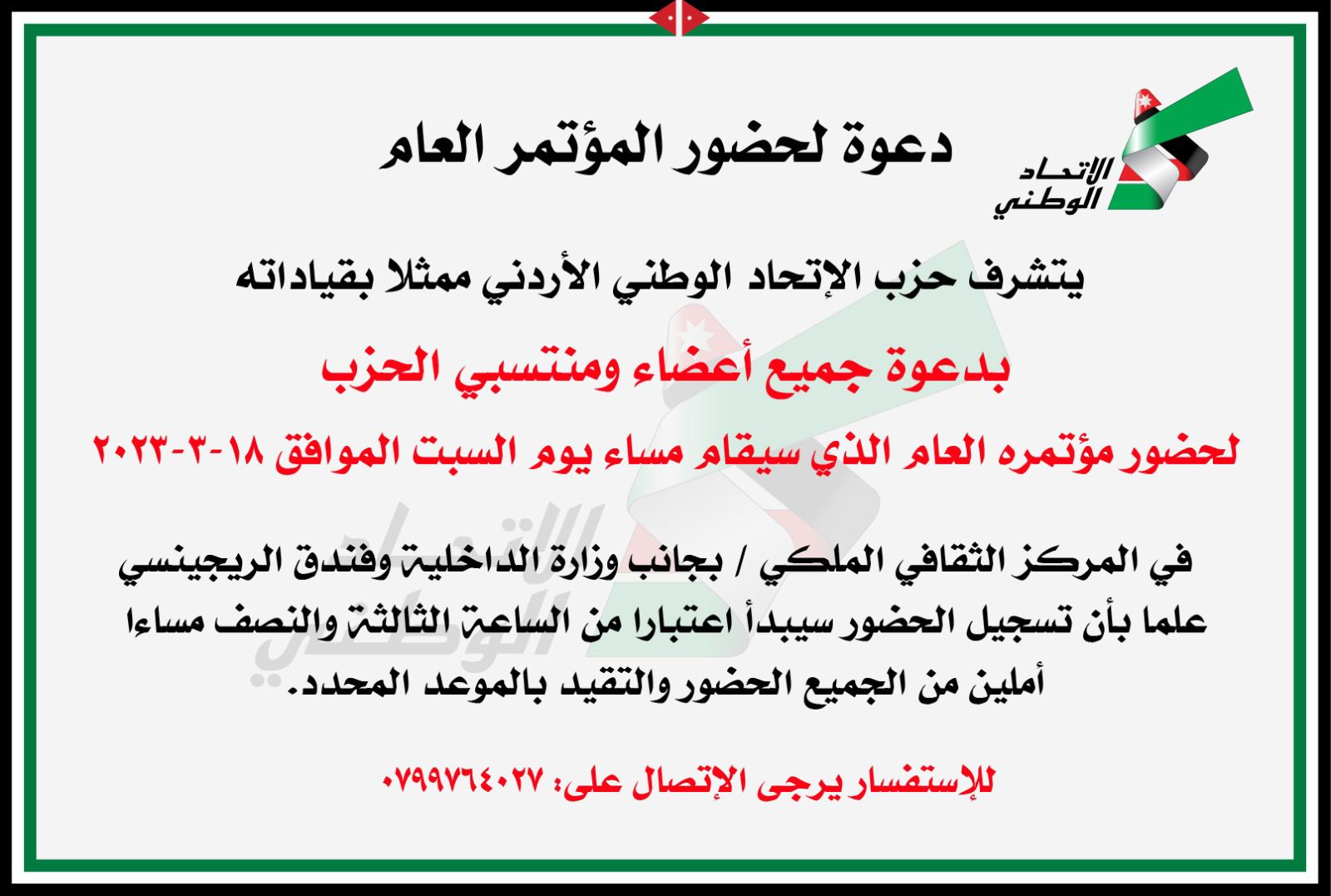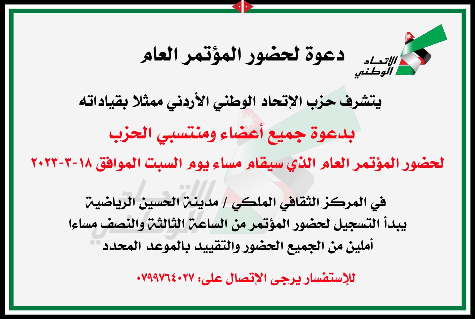 دعوة لحضور مؤتمر حزب الاتحاد الوطني الأردني السبت القادم 2023-03-12 / 12:24pm دعوة لحضور مؤتمر حزب الاتحاد الوطني الأردني السبت القادم