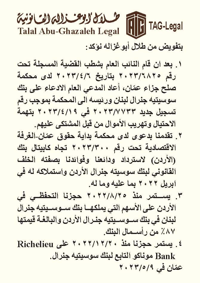 2. تقدمنا بدعوى لدى محكمة بداية حقوق عمّان-الغرفة الاقتصادية تحت رقم 300/2023 تجاه كابيتال بنك (الأردن) لاسترداد ودائعنا وفوائدنا بصفته الخلف القانوني لبنك سوسيته جنرال الأردن واستملاكه له في ابريل 2022 بما عليه وما له.