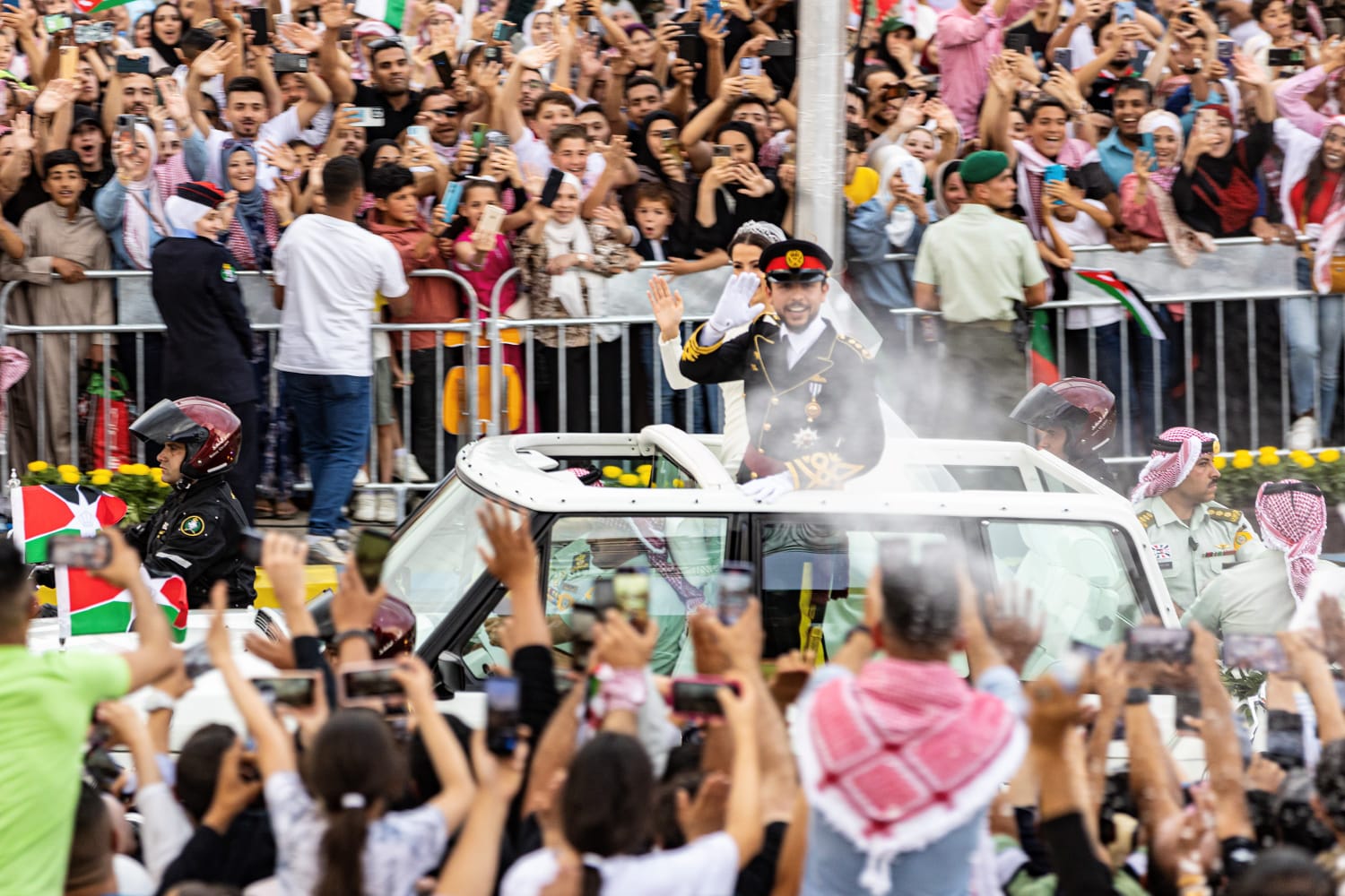 واصطف الحضور في لحظة تاريخية لتحيّة سمو الأمير الحسين والأميرة رجوة الحسين، عند مرور موكب الزفاف - الموكب الأحمر أمام منطقة الاحتفال على دوار الشعب في العاصمة عمان، حيث تجلّت مشاعر الفرح، والمحبة المتبادلة ما بين الأردنيين وأميرهم المحبوب، في مشهد مهيب عكس حجم الفرحة الأردنية ابتهاجاً بزفاف ولي العهد.