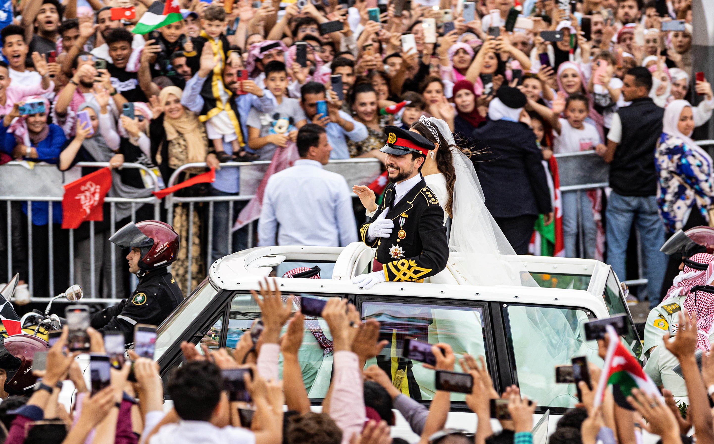 واصطف الحضور في لحظة تاريخية لتحيّة سمو الأمير الحسين والأميرة رجوة الحسين، عند مرور موكب الزفاف - الموكب الأحمر أمام منطقة الاحتفال على دوار الشعب في العاصمة عمان، حيث تجلّت مشاعر الفرح، والمحبة المتبادلة ما بين الأردنيين وأميرهم المحبوب، في مشهد مهيب عكس حجم الفرحة الأردنية ابتهاجاً بزفاف ولي العهد.
