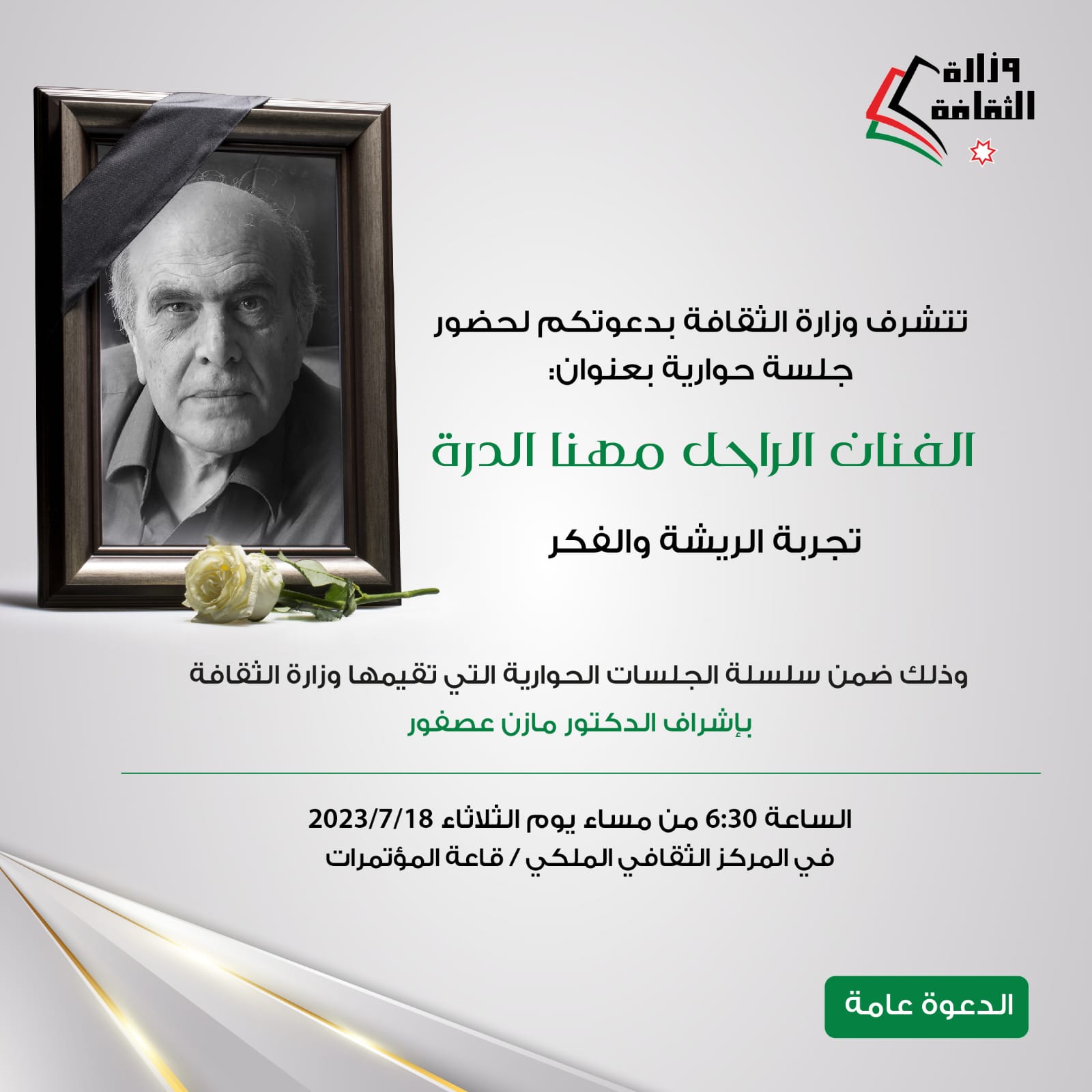 ضمن سلسلة الحوارات الفنية المفتوحة والتي تقيمها وزارة الثقافة من إعداد وتقديم الأستاذ الدكتور مازن عصفور، تعقد في الساعة السادسة والنصف في قاعة المؤتمرات بالمركز الثقافي الملكي جلسة حوارية بعنوان: "تجربة الريشة والفكر" عن الفنان الراحل مهنا الدرة. تستهل الجلسة قبل ان يستعرض الناقد عصفور أبرز المحطات الفكرية والأسلوبية في تجربة الدرة، بعرض فيلم فيديو قصير عن أهم مراحل مسيرته الفنية الطويلة والخصبة التي ترسخت فيها بصماته في الحركة الفنية المحلية والعربية والعالمية منذ عقود .