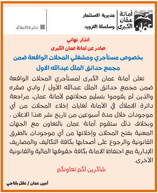 انذار نهائي صادر عن امانة عمان بخصوص مستاجري ومشغلي محلات حدائق الملك عبد الله الاول 2016-12-17 / 08:04am