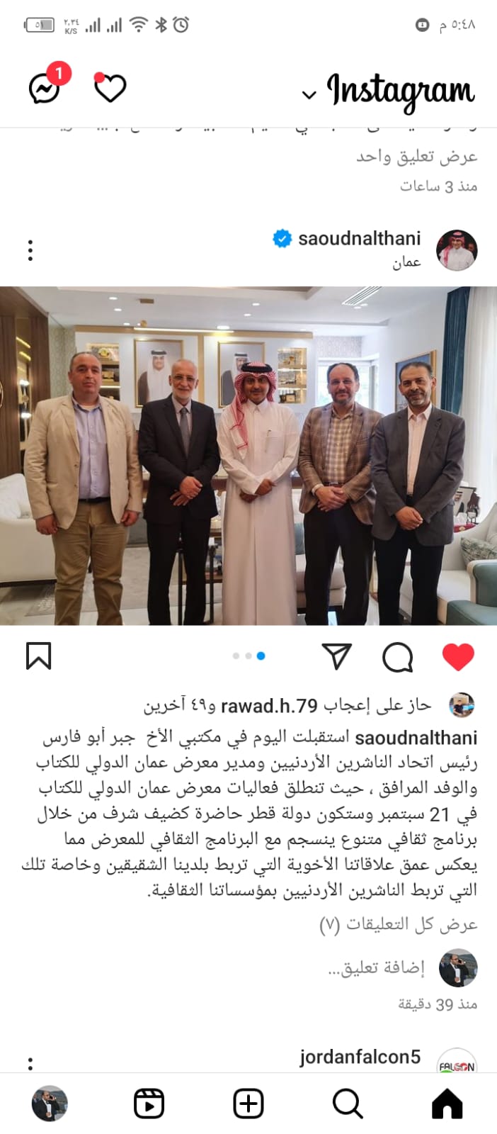 عمان 28 آب (اتحاد الناشرين) – التقى سفير دولة قطر في عمان الشيخ سعود بن ناصر بن جاسم آل ثاني، اليوم الإثنين في مكتبه رئيس اتحاد الناشرين الأردنيين، ومدير معرض عمان الدولي للكتاب جبر أبو فارس، وأعضاء من الهيئة الإدارية للاتحاد.