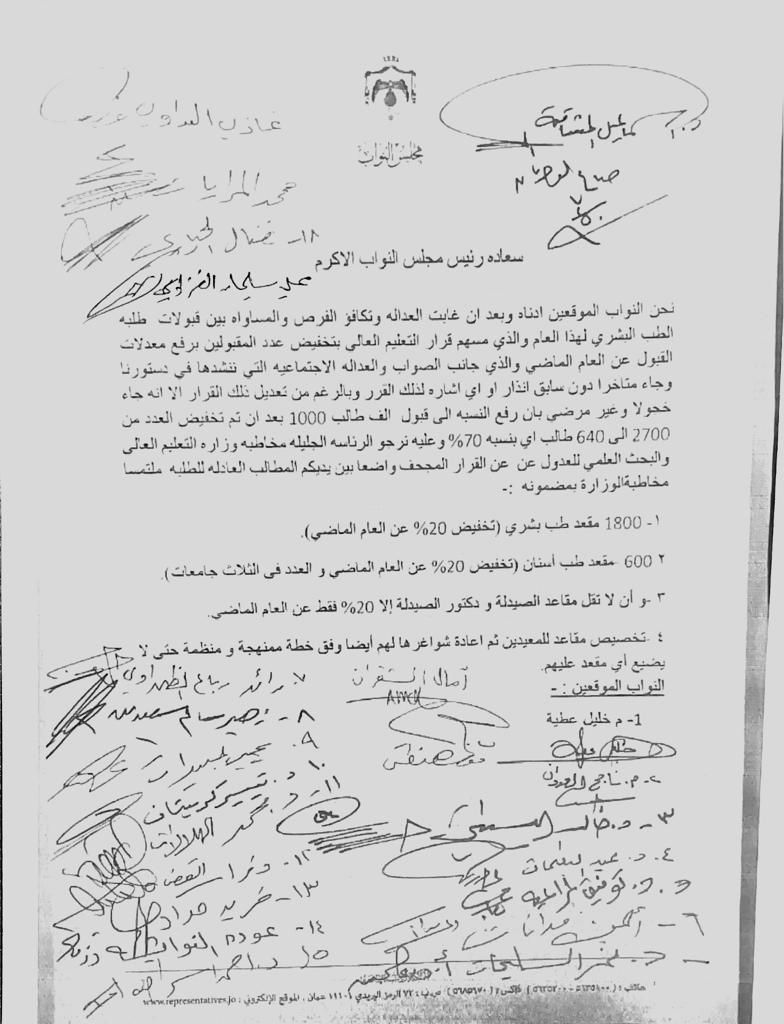 نحن النواب الموقعين ادناه وبعد ان غابت العداله وتكافؤ الفرص والمساواه بين قبولات طلبه الطب البشري لهذا العام والذي مسهم قرار التعليم العالي بتخفيض عدد المقبولين برفع معدلات القبول عن العام الماضي والذي جانب الصواب والعداله الاجتماعيه التي ننشدها في دستورنا وجاء متاخرا دون سابق انذار او اي اشاره لذلك القرر وبالرغم من تعديل ذلك القرار الا انه جاء خجولا وغير مرضي بان رفع النسبه الى قبول الف طالب 1000 بعد ان تم تخفيض العدد من 2700 الى 640 طالب اي بنسبه 70% وعليه نرجو الرئاسه الجليله مخاطبه وزاره التعليم العالي والبحث العلمي للعدول عن عن القرار المجحف واضعا بين يديكم المطالب العادله للطلبه ملتمسا مخاطبةالوزارة بمضمونه :-
