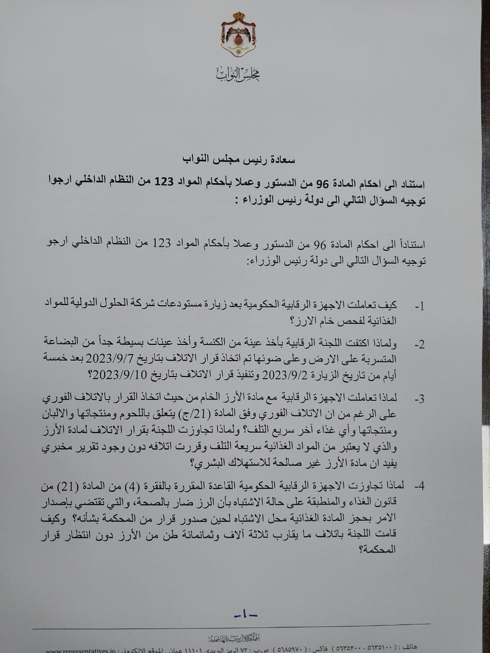 استناداً الى احكام المادة 96 من الدستور وعملا بأحكام المواد 123 من النظام الداخلي ارجو توجيه السؤال التالي الى دولة رئيس الوزراء: