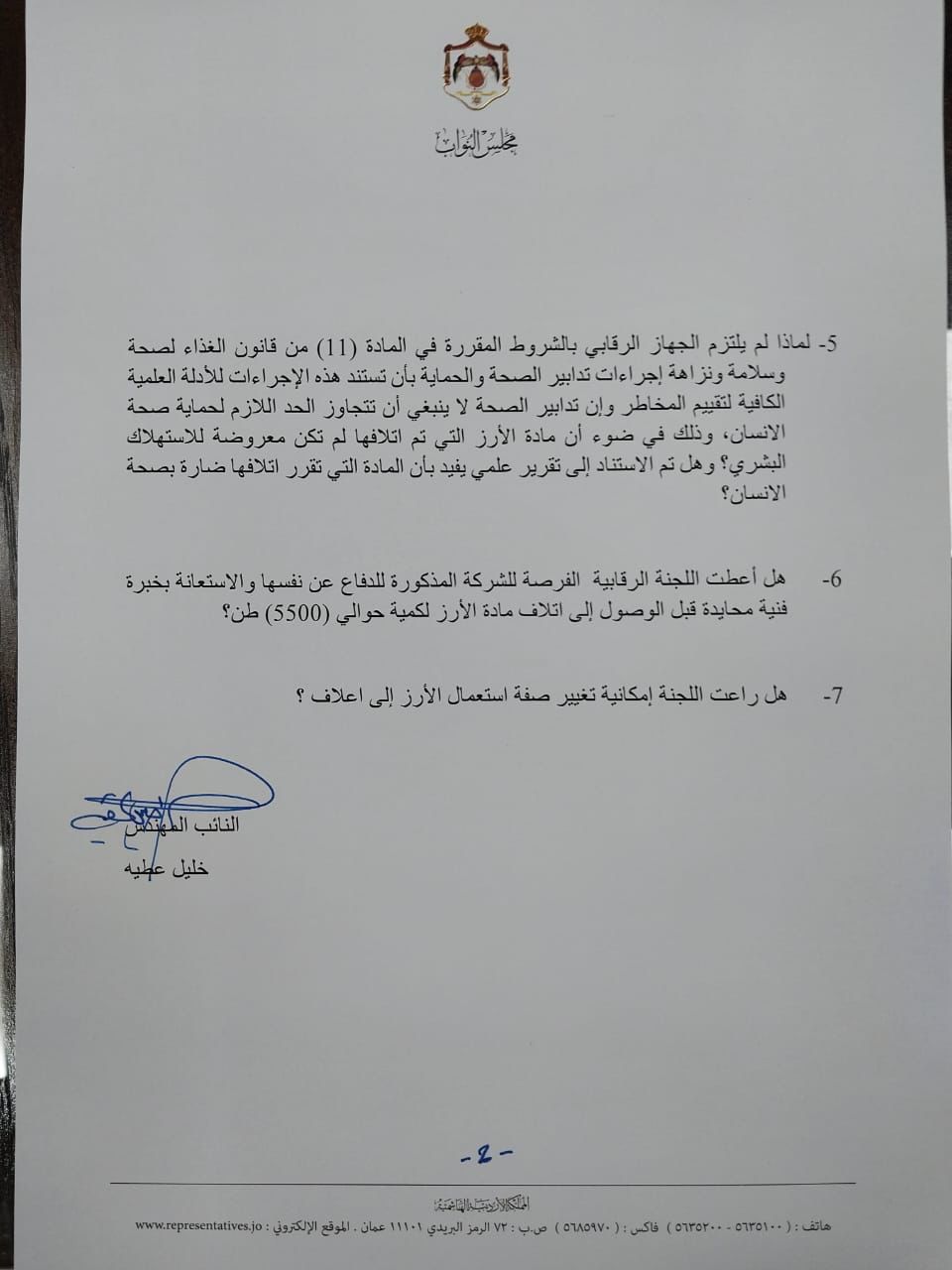 4- لماذا تجاوزت الاجهزة الرقابية الحكومية القاعدة المقررة بالفقرة (4) من المادة (21) من قانون الغذاء والمنطبقة على حالة الاشتباه بأن الرز ضار بالصحة، والتي تقتضي بإصدار الامر بحجز المادة الغذائية محل الاشتباه لحين صدور قرار من المحكمة بشأنه؟ وكيف قامت اللجنة باتلاف ما يقارب ثلاثة آلاف وثمانمائة طن من الأرز دون انتظار قرار المحكمة؟