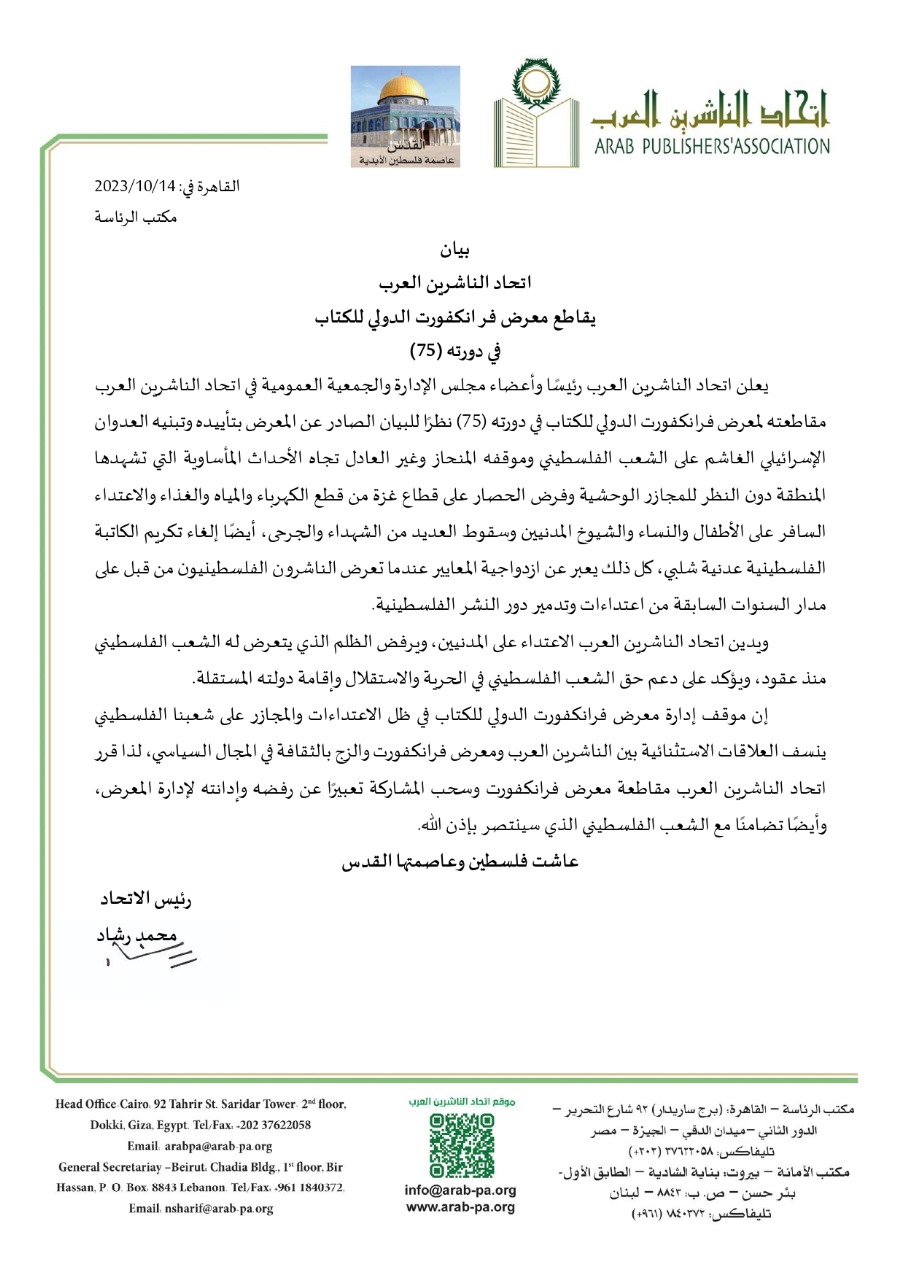 اتحاد الناشرين العرب يقاطع معرض فرانكفورت الدولي للكتاب في دورته ٧٥ 2023-10-14 / 08:52pm المركب الاخباري