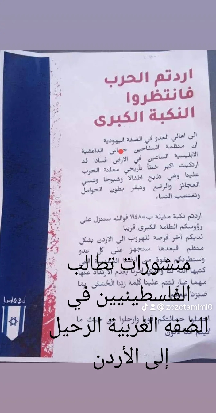 - وعد مستوطنون إسرائيليون فلسطينيي الضفة الغربية المحتلة بـ”نكبة كبرى” جديدة على غرار ما حدث عام 1948 “بما في ذلك القتل والتهجير”، وذلك في ظل الحرب بين الاحتلال وفصائل المقاومة في قطاع غزة.وذكرت وسائل إعلام فلسطينية أن مستوطنين “وضعوا منشورات على مركبات المزارعين الفلسطينيين قرب بلدة ديراستيا، شمال غرب سلفيت (شمال)”، ونشرت منصات صورا لتلك الملصقات.كما أفادت وكالة الأنباء الفلسطينية “وفا” أن تلك المنشورات -التي كتبت باللغة العربية- تضمنت “تهديد المواطنين الفلسطينيين في الضفة الغربية، وأن عليهم مغادرة قراهم وبلداتهم والتوجه إلى الأردن، وإذا لم يغادروها سيتم الهجوم وتهجير الفلسطينيين بالقوة”.وتداول ناشطون ومنصات صورة ملصق على إحدى المركبات ورد فيه ” أردتم نكبة مثيلة بعام 1948 فوالله ستنزل على رؤوسكم الطامة الكبرى قريبا، لديكم آخر فرصة للهروب إلى الأردن بشكل منظم فبعدها سنجهز على كل عدو وسنطردكم بقوة من أرضنا المقدسة التي كتبها الله لنا”، وفق المنشور المتداول.