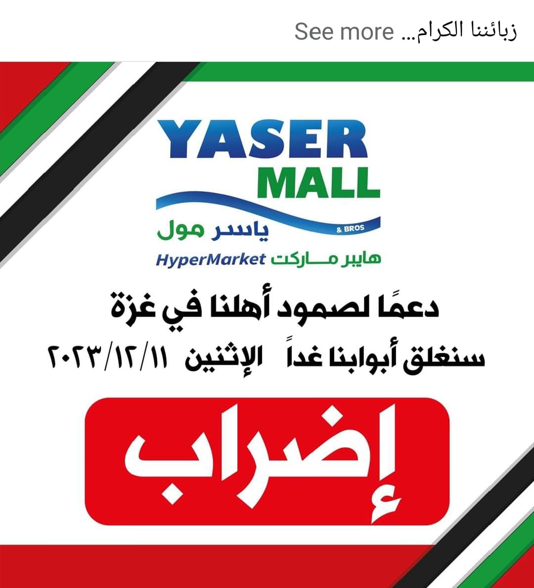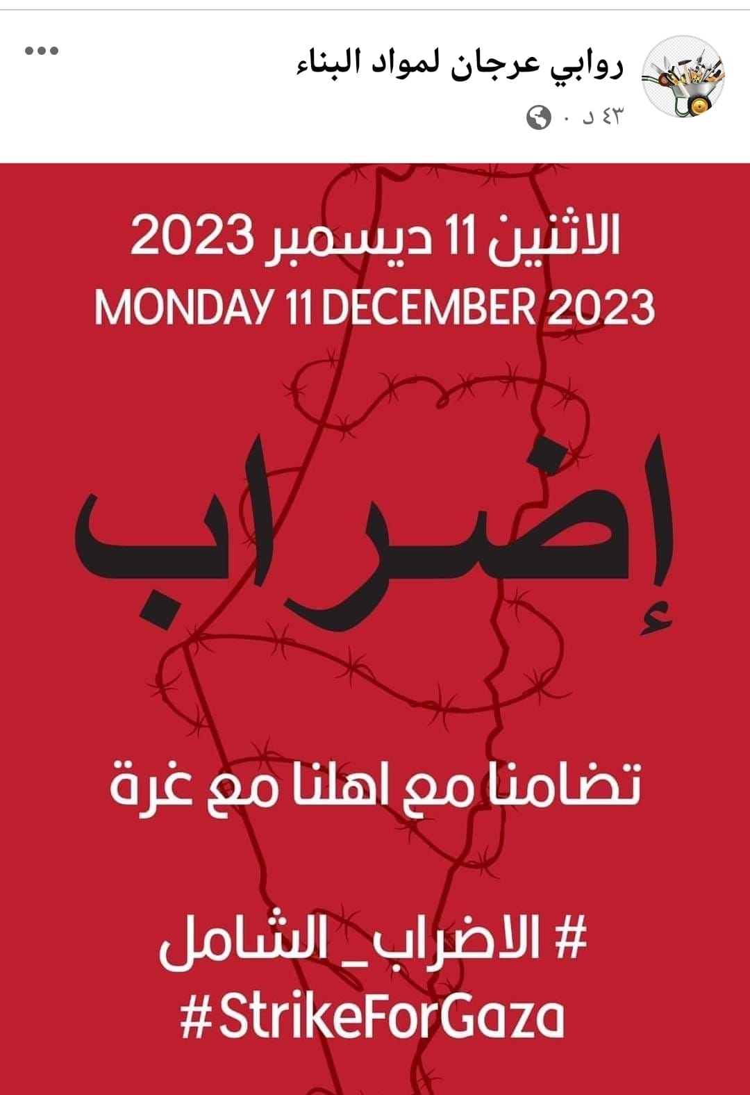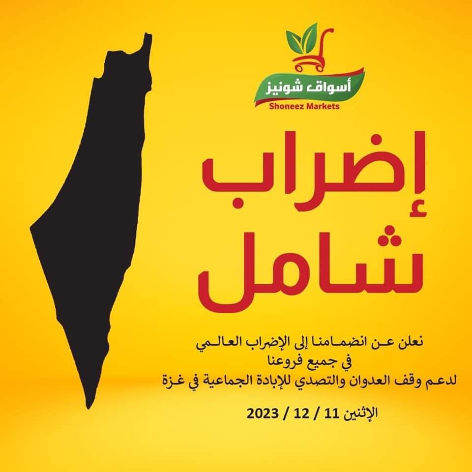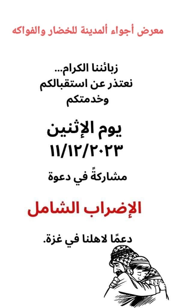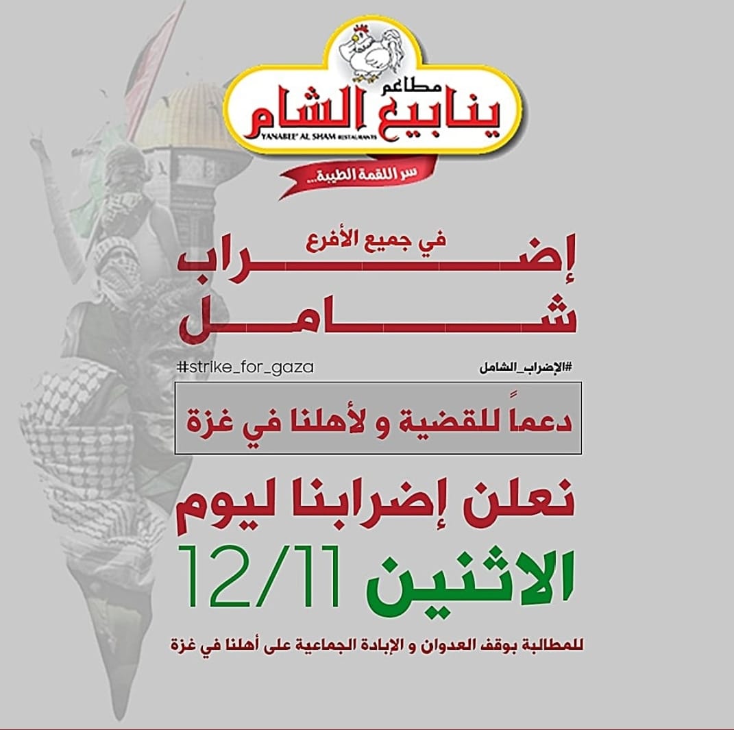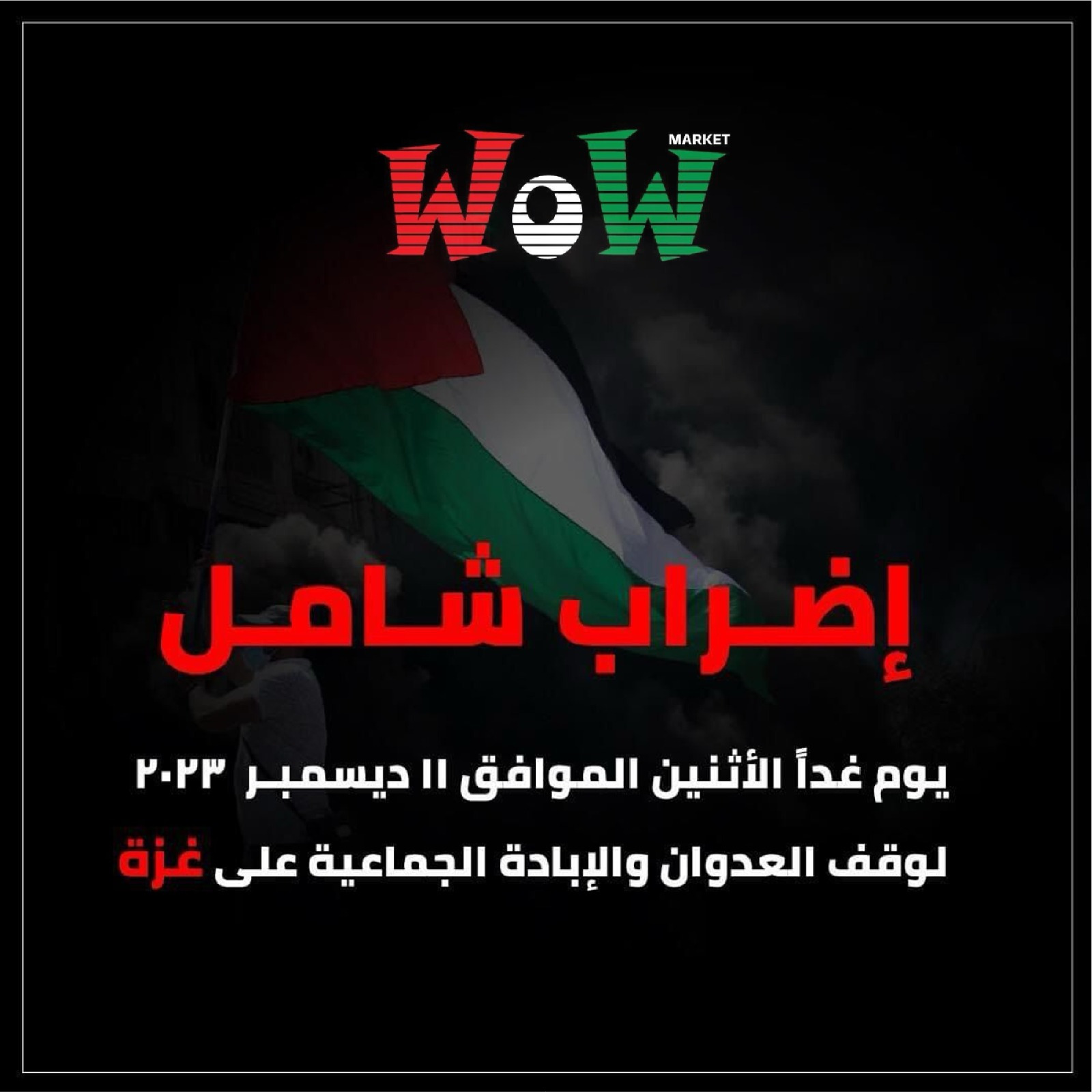 أعلنت عدة قطاعات تجارية ومنشآت ومؤسسات؛ مشاركتها في الإضراب العام عن العمل، اليوم الاثنين، تضامنا مع قطاع غزة؛ وتنديدا بالإبادة الجماعية التي يتعرّض لها الفلسطينيون هناك