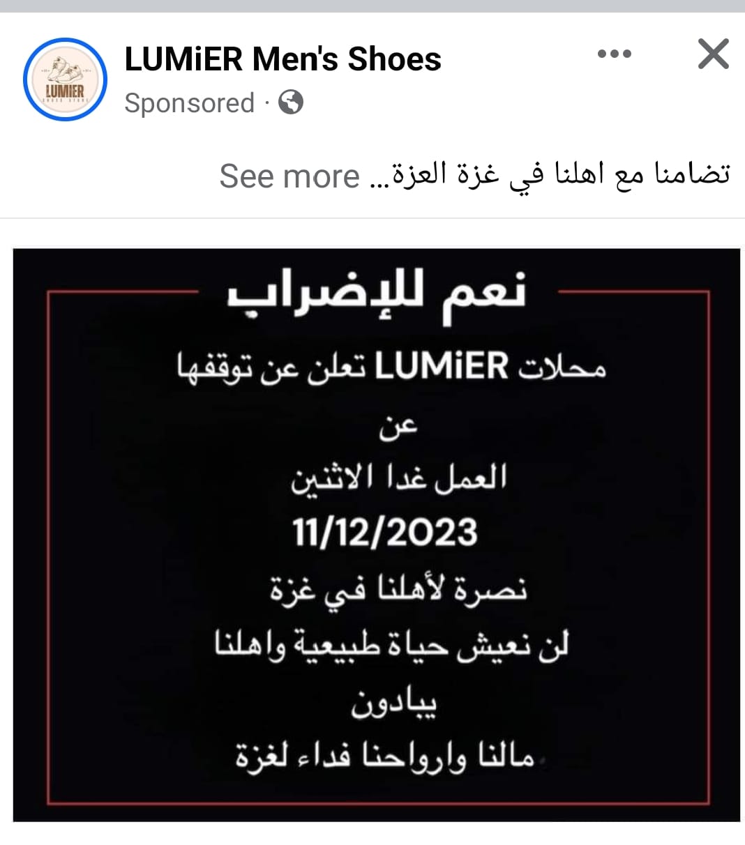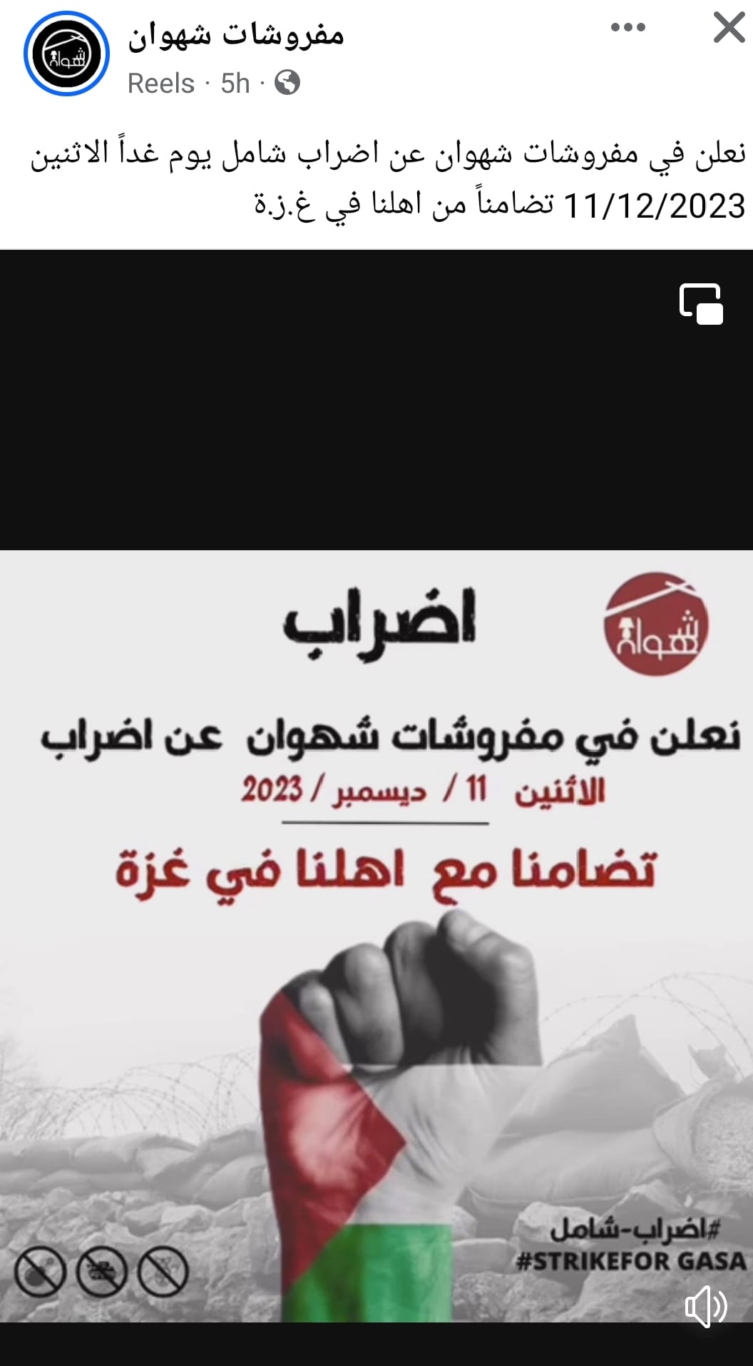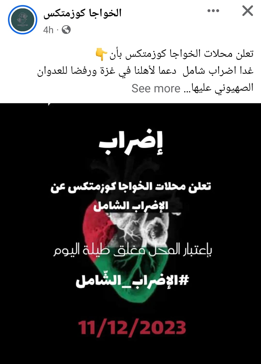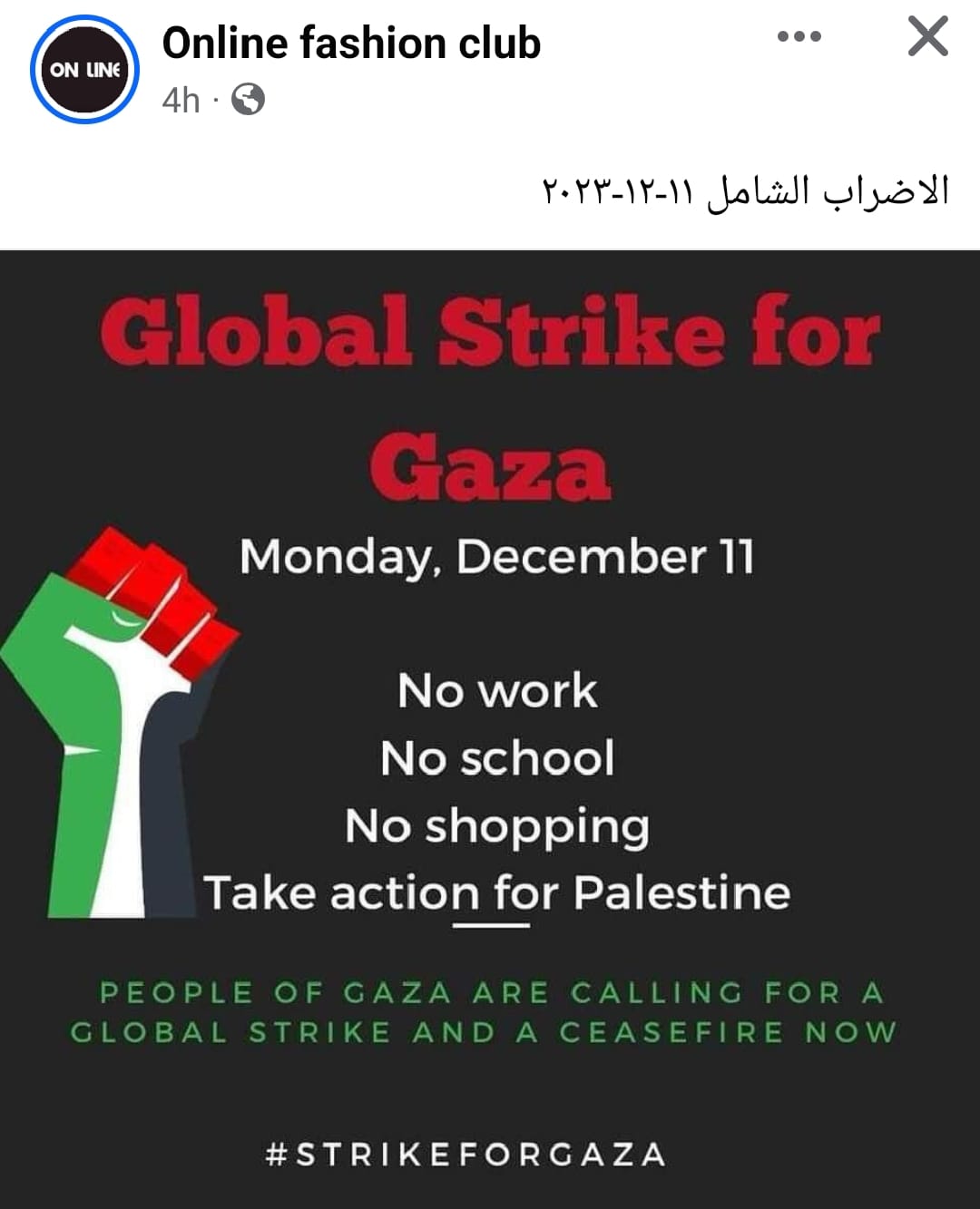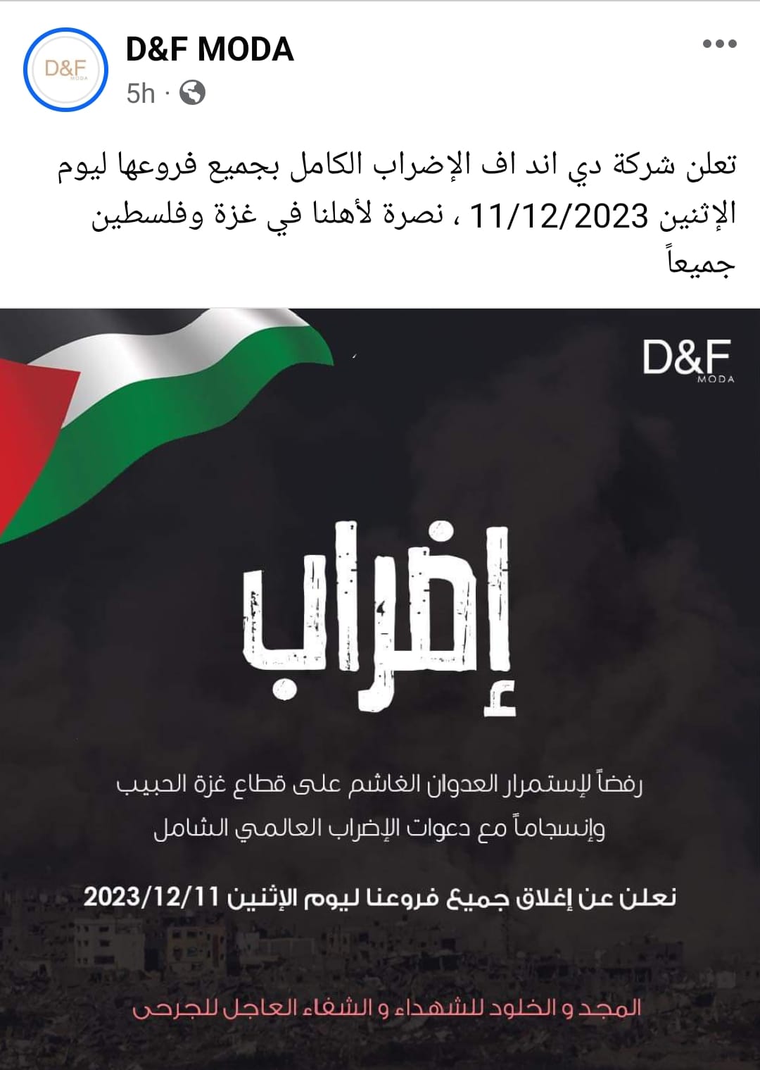 وأكد قطاع تجار الألبسة والأقمشة والأحذية مشاركتهم في الاضراب تضامنا مع الأهل في فلسطين وقطاع غزة، واستهجانا ورفضا للفيتو الامريكي ضد وقف إطلاق النار
