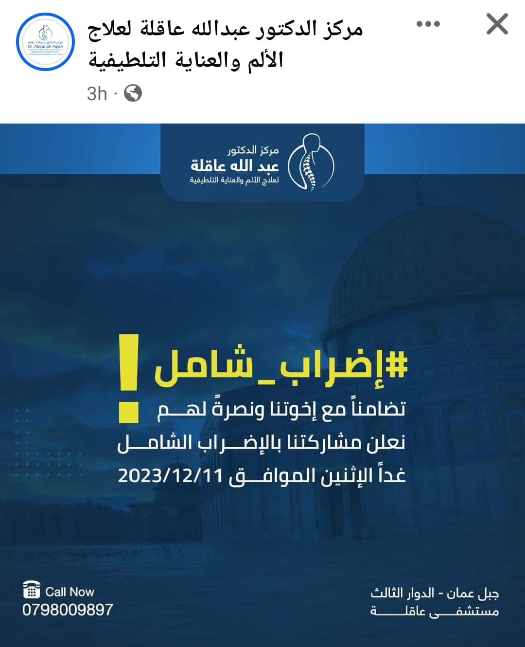 ومن جانبها، دعت نقابة الأطباء الأردنية منتسبيها إلى التوقف عن العمل لمدة ساعتين في جميع أماكن عملهم ،وذلك من الساعة الثانية عشر ظهرا ولغاية الساعة الثانية بعد الظهر، مع التأكيد أن التوقف عن العمل لا يشمل أقسام الطوارئ او أي حالة طارئة