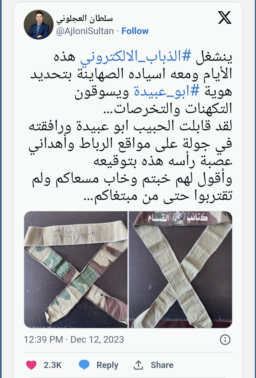 وقال العجلوني في تغريدته تاليا : " ينشغل الذباب_الالكتروني هذه الأيام ومعه اسياده الصهاينة بتحديد هوية ابو_عبيدة ويسوقون التكهنات والتخرصات… لقد قابلت الحبيب ابو عبيدة ورافقته في جولة على مواقع الرباط وأهداني عصبة رأسه هذه بتوقيعه وأقول لهم خبتم وخاب مسعاكم ولم تقتربوا حتى من مبتغاكم "