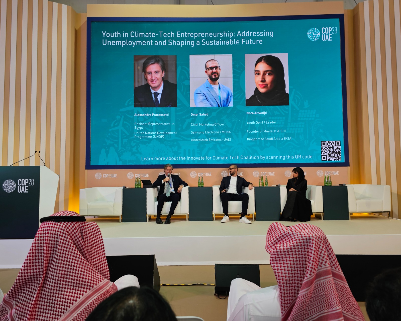 وناقش المشاركون في الجلسة التحديات والفرص التي يواجهها رواد الأعمال الشباب في قطاع تكنولوجيا المناخ، ودور القطاع في خلق فرص عمل للشباب، فضلاً عن مبادرات سامسونج في تطوير التكنولوجيا الخضراء والمستدامة والاستثمار فيها.
