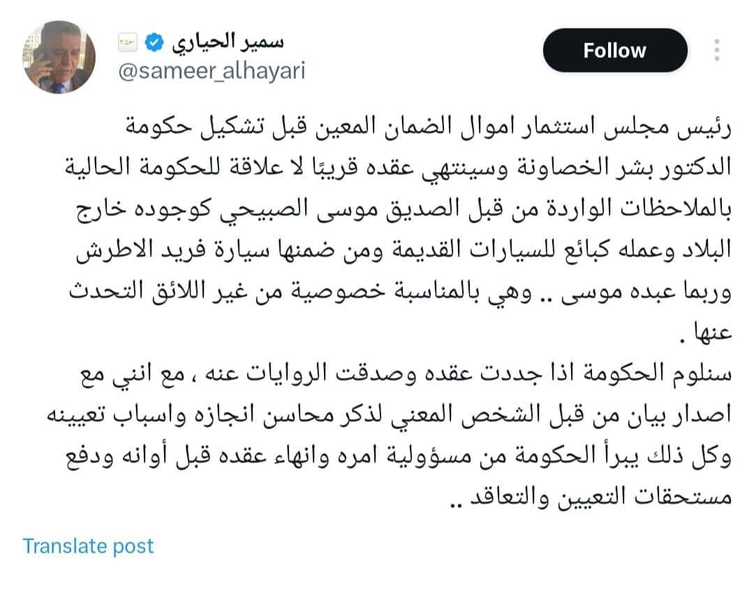 كتب الصديق الأستاذ سمير الحياري صاحب عمون مغرّداً على منصة "X" ومُعلّقاً على ما كتبته أمس عن تعيين الحكومة لشخص مقيم خارج المملكة رئيساً لمجلس استثمار أموال الضمان، كتبَ يقول بأن حكومة الرئيس الخصاونة لا علاقة لها بهذا الموضوع، وأنه يلومها فيما إذا جدّدت عقده الموشك على الانتهاء.!