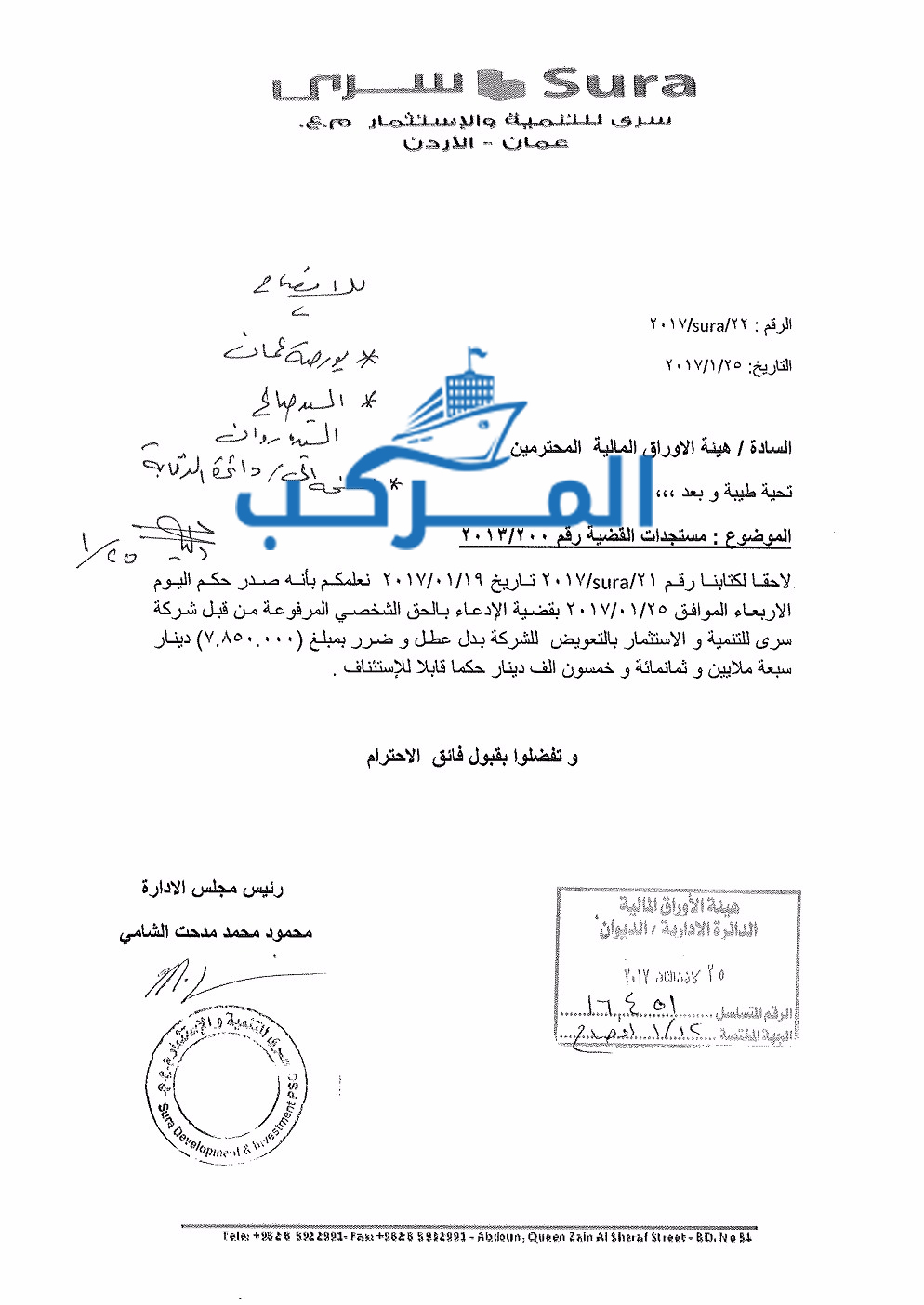 سرى للتنمية تكسب قضيتها ضد فايز ومعتصم الفاعوري بتعويض 7,8 مليون دينار - وثيقة