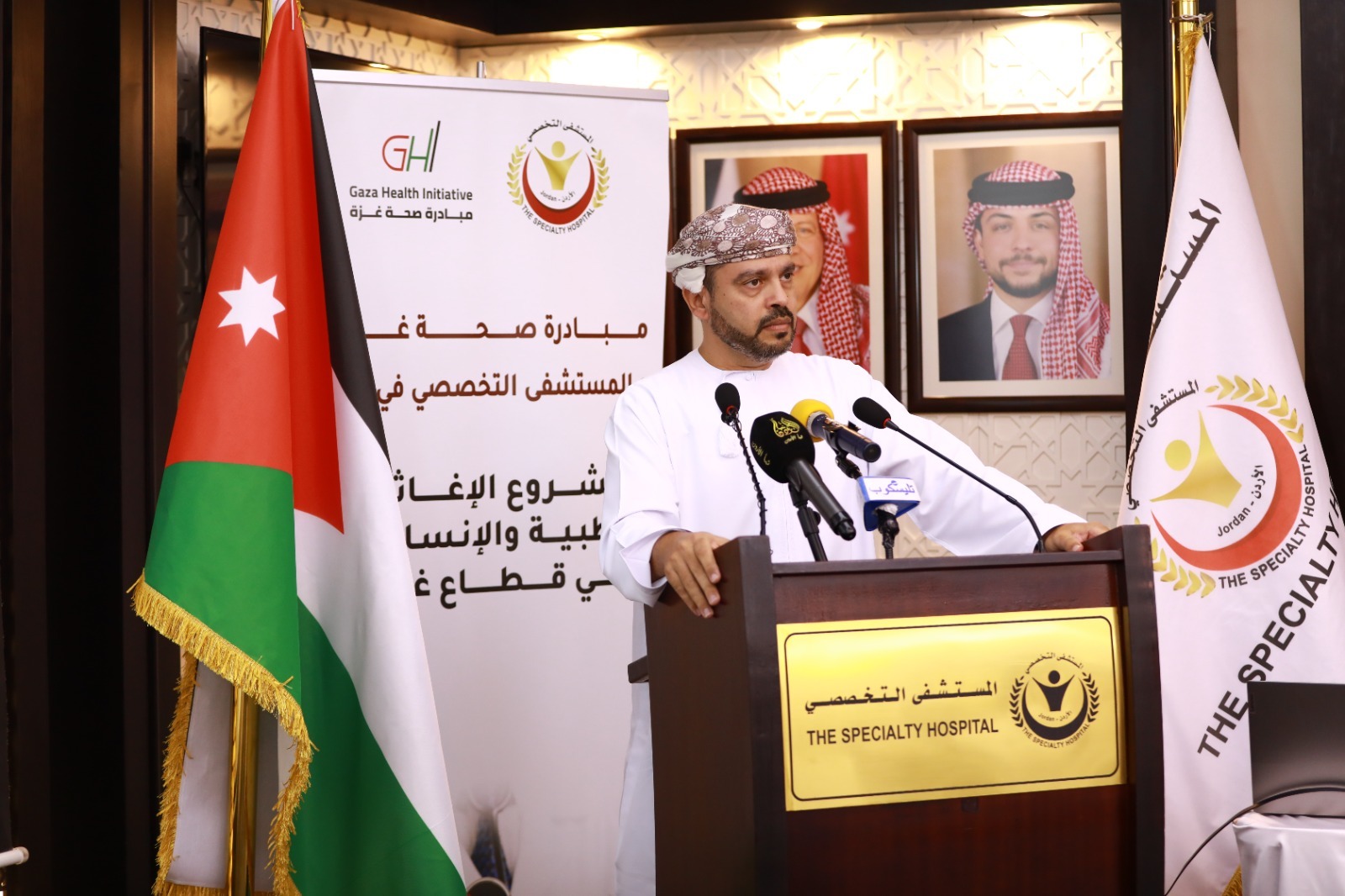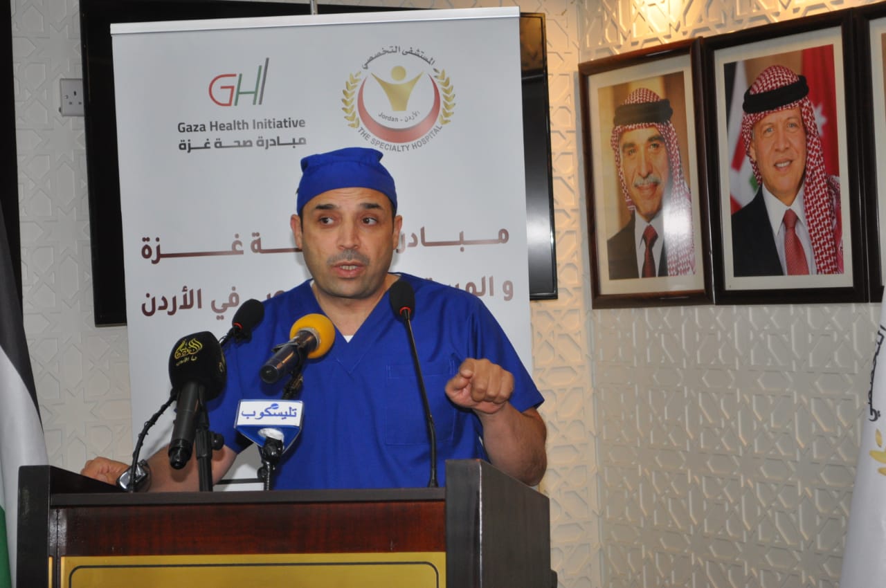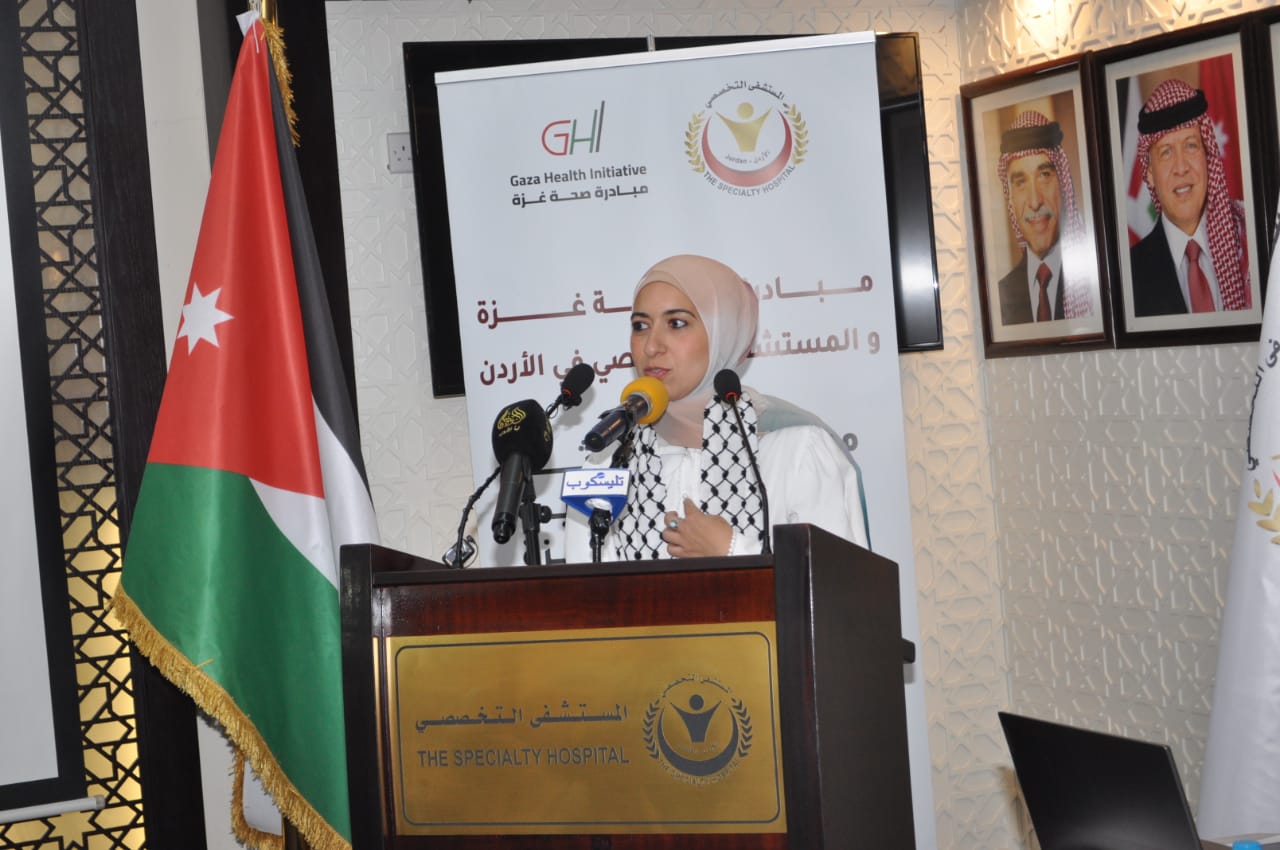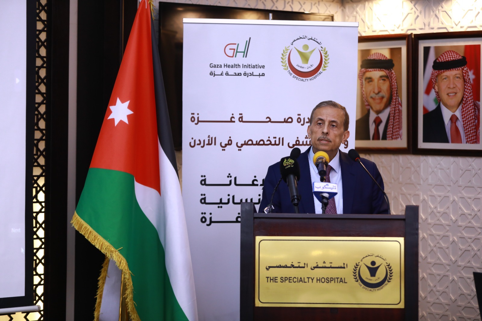 وبيّن الحموري في كلمته إلى ما وصلت إليه مبادرة صحة غزة والتي اصبحت تضم ما يزيد عن 50 منظمة وجمعية ومؤسسة صحية وانسانية من حول العالم ، وأشار الى اختتام المؤتمر الدولي الثاني للمبادرة والذي كان بعنوان "العدالة لغزة" في الجامعة الأميركية في بيروت، حيث يجري تنفيذ عدة خطط هامة ومنها إطلاق تحالف دولي للتعليم الصحي لدعم نظام التعليم في غزة حيث باشر طلبة الطب في غزة بإكمال دراستهم عن بعد من خلال الجامعة الافتراضية التي اطلقت مؤخرا ويشارك فيها عشرات الاساتذة من مختلف دول العالم، بالإضافة إلى إعلانه عن إرسال عشرات أجهزة (اللابتوب والتابلت) لطلاب الطب لإكمال دراستهم، إلى جانب المساهمة في دفع الرسوم الجامعية لطلاب الطب الذين يدرسون خارج القطاع، والسعي لتعزيز الجهود القانونية لاستعادة السلام والإنصاف وحقوق الإنسان للشعب الفلسطيني، مطالباً المجتمع الدولي بضرورة حماية المستشفيات والمراكز الصحية المتبقية في القطاع وتسهيل إدخال المساعدات الطبية والانسانية والمزيد من الفرق الطبية، معلناً عن إطلاق حملة جديدة لتزويد القطاع بالأدوية والمستلزمات الصحية استكمالاً للدور الذي يقوم به المستشفى التخصصي منذ بدء العدوان على القطاع مشيراً إلى أن هذه الحملة ستركز على المكملات الغذائية (الفيتامينات) بعد سماع صرخات استغاثة من سيدات وأطفال القطاع يشتكون من آلام شديدة ناتجة عن نقص أو انعدام غالبية الاصناف الغذائية، كما ثمن دور الشركاء في تقديم مختلف أنواع الدعم لأهل غزة، وخص بالذكر المنظمات التي تسهل وصول الفرق الطبية الى قطاع غزة ومنها مؤسسة رحمة حول العالم ومؤسسة PROJECT HOPE وجمعية PCRF .