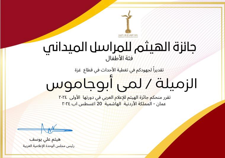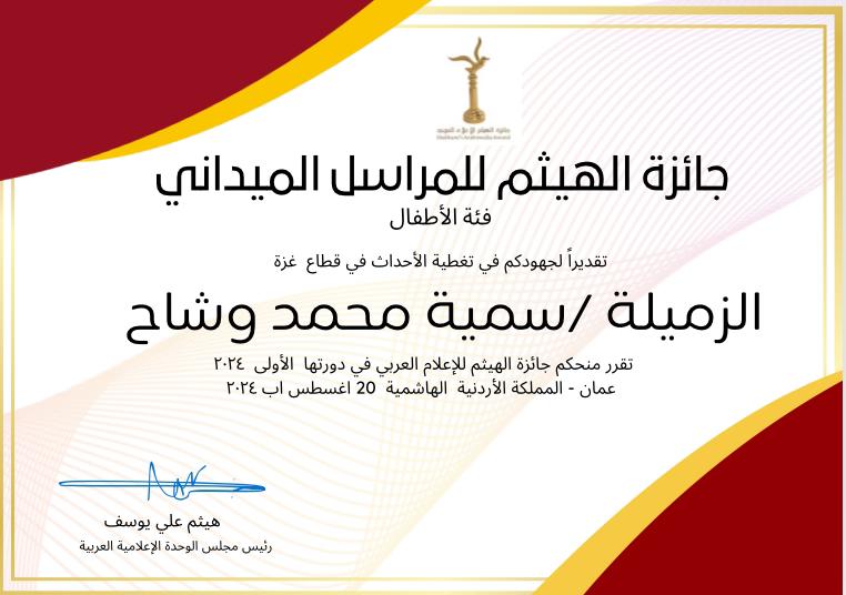 اعلن مجلس الوحدة الإعلامية العربية وأكاديمية كواليس لاعلام الأطفال في المملكة الأردنية الهاشمية عن فوز كل من الطفلة سمية محمد وشاح والطفلة لمى ابو جاموس عن فوزهما " بجائزة الهيثم للمراسل الميداني فئة ألأطفال" في دورتها الأولى ٢٠٢٤