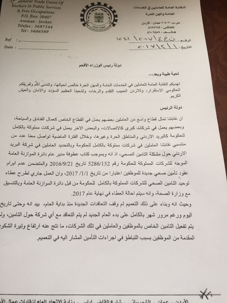 جاءت تصريحات ابو مرجوب في اعقاب توجيه مذكرة الى رئيس الوزراء وضعه فيها بصورة اوضاع العمال والموظفين وبتبعات قرار مدير الموازنة بكتابه الموجه للشركات المملوكة للحكومة والمتضمن الطلب بعدم ابرام عقود تأمين صحي جديدة للموظفين ، بحجة ان هناك توجه لطرح عطاء توحيد التأمين الصحي للشركات المملوكة للحكومة بالكامل.