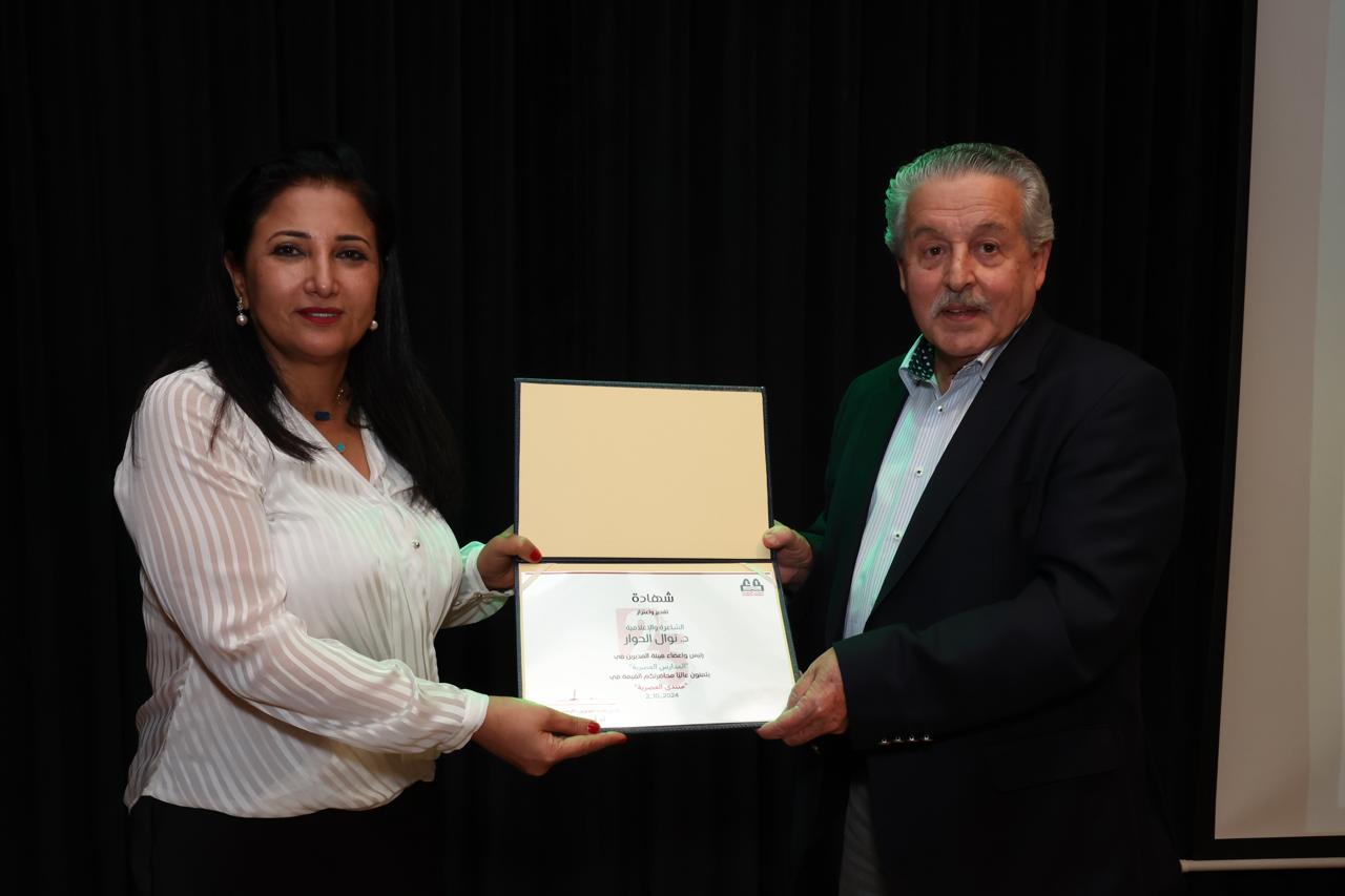هذا، وشهدت الأمسية –التي ناهزت الساعة والنصف – حضورا لافتا ومشاركة واسعة واعجاباً كبيراً، وانتهى اللقاء بتقديم د. اسعد عبدالرحمن درع تكريمي للضيفة المحاضرة باسم رئيس وأعضاء هيئة المديرين في "المدارس العصرية".