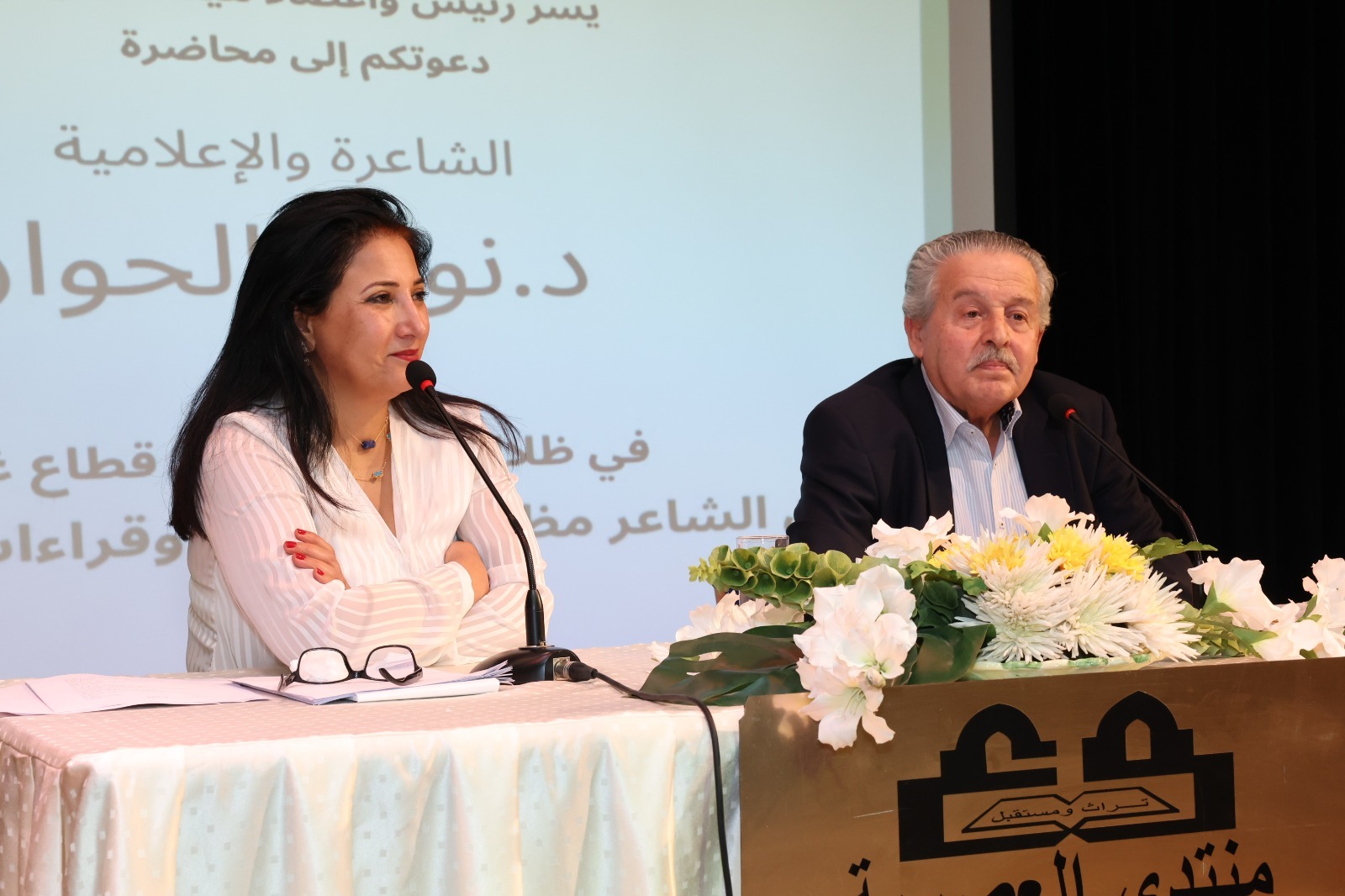 في أمسية حاشدة، وصف الدكتور أسعد عبد الرحمن الشاعرة والإعلامية السورية نوال الحوار بـ "البدوية الحسناء"، أو ابنة "بادية الشام" كما تحب أن تعرف عن نفسها، التي "يتضح من لقبها وحديثها درجة ايمانها الكبيرة بالحوار!!"، وأضاف: "أنه من دواعي سرورنا استضافة الشاعرة الكبيرة صاحبة دواوين: "قهوة المساء" و"القطا في مهب العطش" و"تغريبة الغزالة" وغيرها، للحديث عن مظفر القدس عروبتكم، مظفر يازهرة النيران في ليل الجليل/ اما فلسطين واما النار جيل بعد جيل..مظفر هل عرب انتم؟ وكل هذا في ظل الأحداث الجسيمة التي تمر بها منطقتنا، وحرب الإبادة التي تشنّها سلطات الاحتلال الاسرائيلية ضد أهلنا في غزة ولبنان، إضافة الى ما يحصل في الضفة الغربية والقدس المحتلة من أعمال قمع وقتل واعتقال وانتهاك يومي.. وفي ظلال التناقضات والتحولات والتغيرات الكبرى التي تشهدها الحالتين "العربية" و"الفلسطينية".
