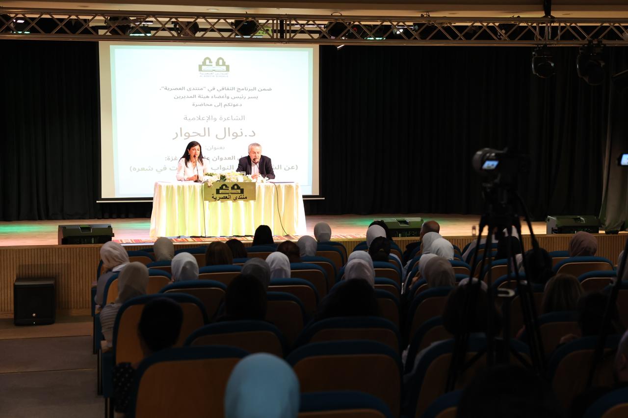 جاء ذلك خلال تقديم الدكتورعبدالرحمن للشاعرة في الأمسية التي نظمها: “منتدى العصرية” المنبثق عن “المدارس العصرية” مساء الأربعاء، ضمن البرنامج الثقافي في "المنتدى"، وامتدت إلى أمسية لاحقة في "النادي الارثوذكسي"، وحملت عنوان: (في ظلال العدوان على قطاع غزة: عن الشاعر مظفر النواب....وقراءات في شعره)، شرحت وشرّحت فيها الشاعرة - "الظاهرة النوابية"، وألقت عدداً من قصائد الشاعر العامية والفصيحة، واضاءت على اسباب انتشار أشرطته التي باتت تنافس أشرطة الفنانين المشهورين.