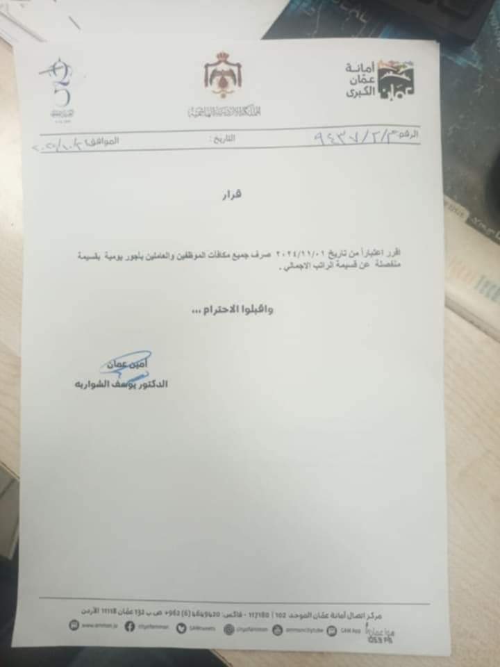 تواصل معي عدد من العاملين في أمانة عمان الكبرى على نظام المياومة وبأجور شهرية، يشتكون من أن الأمين أصدر قراراً يوجّه بموجبه بصرف كآفة المكافآت التي يتقاضونها شهرياً بقسيمة منفصلة عن قسيمة الراتب الشهري.