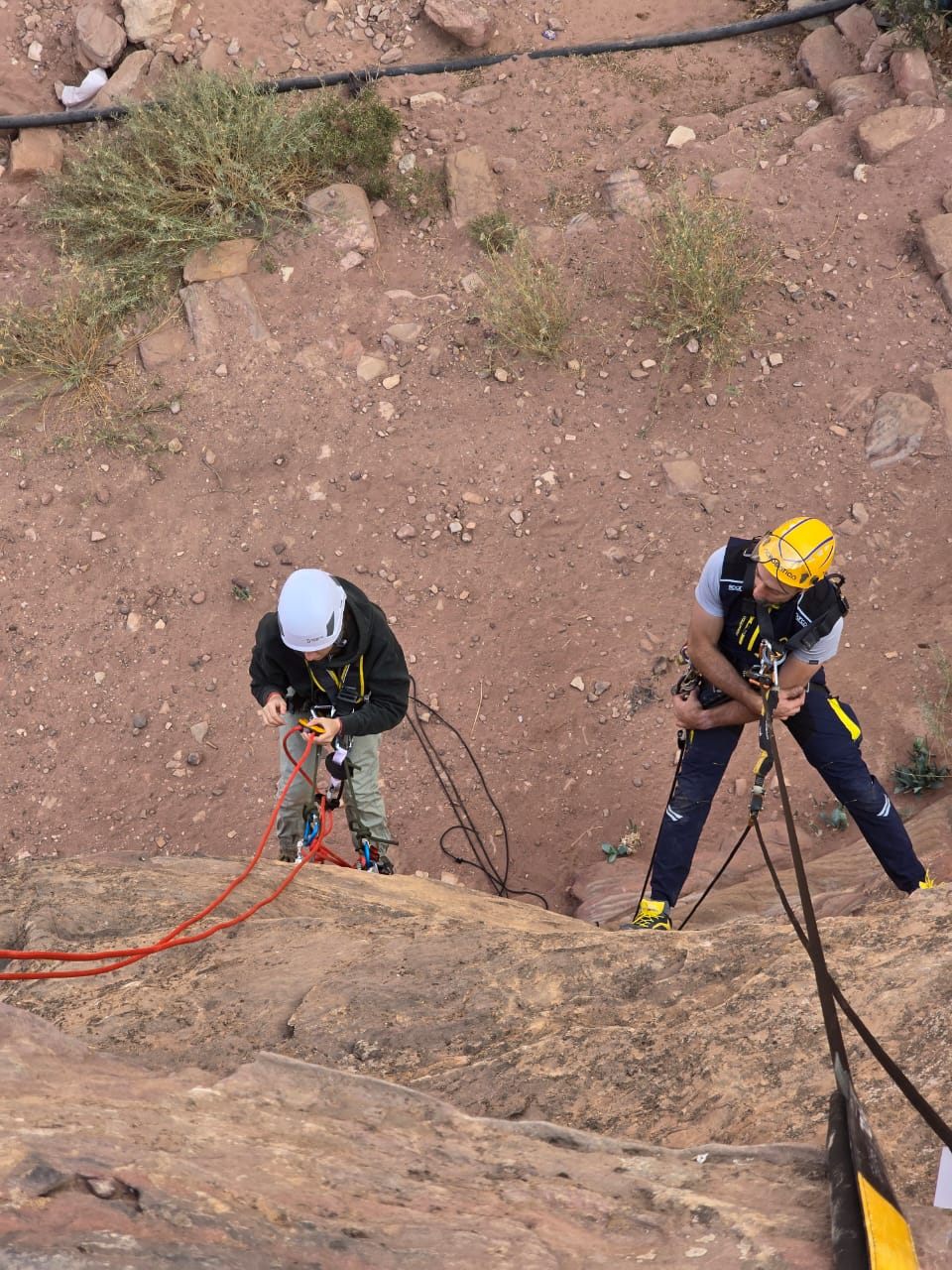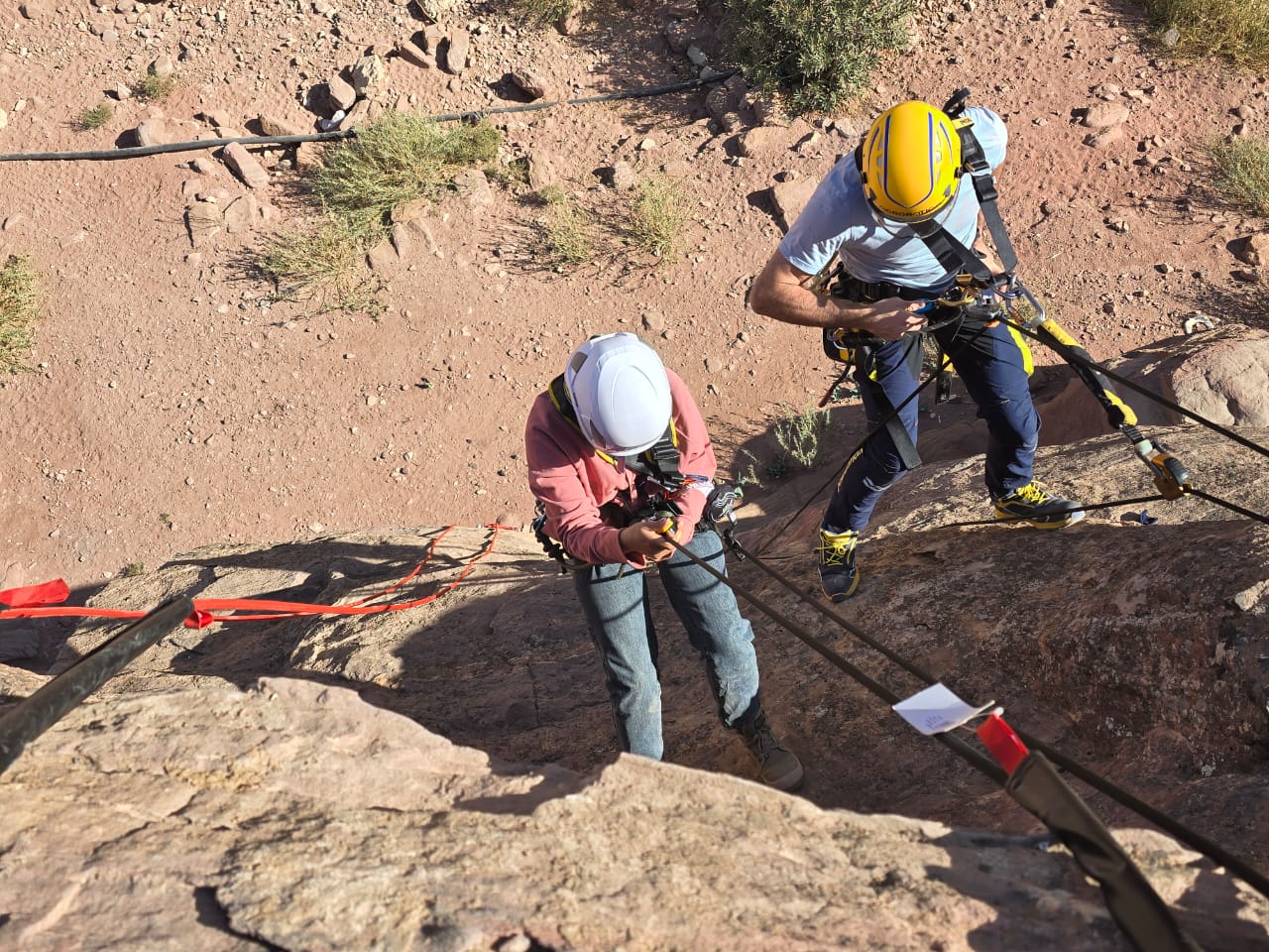 حاليا في الأردن، يشرح المشاركين في المشروع كل من: كل من ستيفانو سولاري وأندريا غوبّي، منسق وخبير الصيانة والترميم في "أكروباتيكا “، سنواصل الرحلة التي بدأناها في فلورنسا، حيث تناولنا النظريات المتعلقة بنقاط التثبيت والعقد الضرورية للعمل بأمان باستخدام الحبال. سنستكمل الجانب النظري بالتدريب على ارتفاعات وفي حالات التحليق، بالإضافة إلى مراجعة معدات الحماية الشخصية (PPE) واستخدام الأحزمة بشكل صحيح. وأخيرًا، سننتقل إلى التطبيقات العملية، بدءًا من تثبيت النقاط العلوية، وصولًا إلى استعراض تقنيات النزول والصعود، والانتقال بين النقاط، وتغيير الحبال، وإجراءات الإنقاذ."