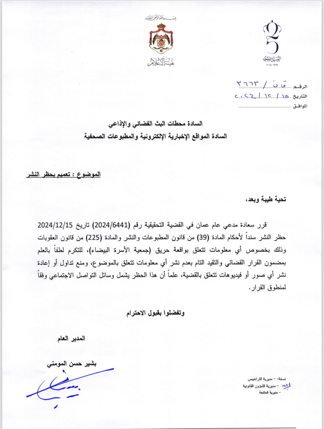 ووجه مدير عام هيئة الإعلام بشير المومني، تعميما للعمل بمضمون القرار القضائي والتقيد التام بعدم نشر أي معلومات تتعلق بواقعة الحريق، ومنع تداول أي صور أو فيديوهات تتعلق بالقضية، علما أن هذا الحظر يشمل وسائل التواصل الاجتماعي وفقا لمنطوق القرار.