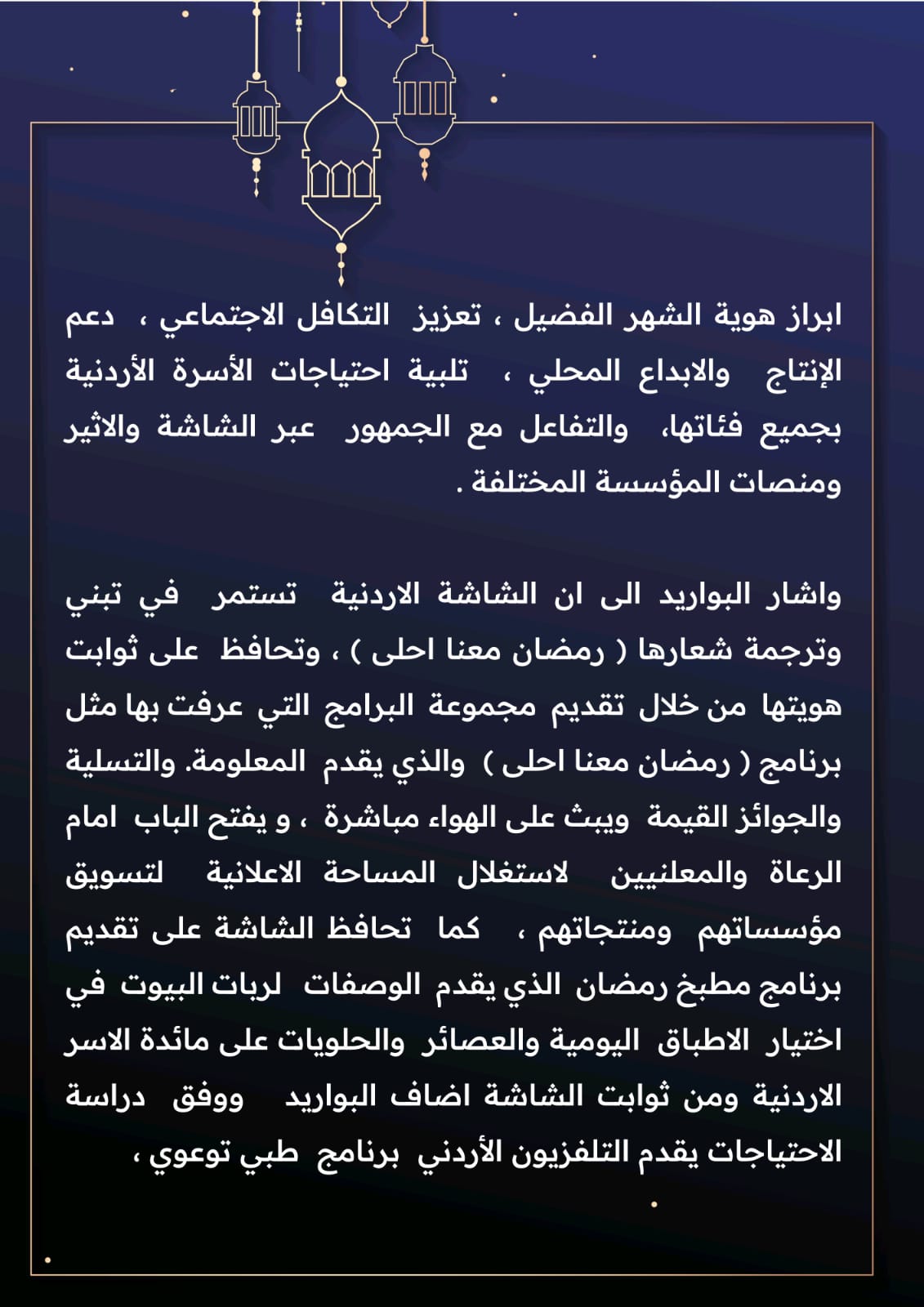 واشار البواريد الى ان الشاشة الاردنية تستمر في تبني وترجمة شعارها ( رمضان معنا احلى ) ، وتحافظ على ثوابت هويتها من خلال تقديم مجموعة البرامج التي عرفت بها مثل برنامج ( رمضان معنا احلى ) والذي يقدم المعلومة. والتسلية والجوائز القيمة ويبث على الهواء مباشرة ، و يفتح الباب امام الرعاة والمعلنيين لاستغلال المساحة الاعلانية لتسويق مؤسساتهم ومنتجاتهم ، كما تحافظ الشاشة على تقديم برنامج مطبخ رمضان الذي يقدم الوصفات لربات البيوت في اختيار الاطباق اليومية والعصائر والحلويات على مائدة الاسر الاردنية ، ومن ثوابت الشاشة اضاف البواريد ووفق دراسة الاحتياجات يقدم التلفزيون الأردني برنامج طبي توعوي ، والبرامج الدينية التي تشمل الفتاوى ( أسالوا اهل الذكر ) وبرنامج القيم الاسلامية ( شفاءالقلوب ) ، وتحافظ على بث برنامج ( المسابقة الهاشمية ) الذي يتنافس به حفظة القرآن الكريم بأصواتهم الندية وبأشراف وزارة الاوقاف والشؤون الاسلامية الى جانب فترة الغروب المنقولة على الهواء مباشرة من مسجد الملك الحسين بن طلال -طيب الله ثراه - ، كما وننقل لكم كما في كل عام المجالس العلمية الهاشمية كل يوم جمعة .