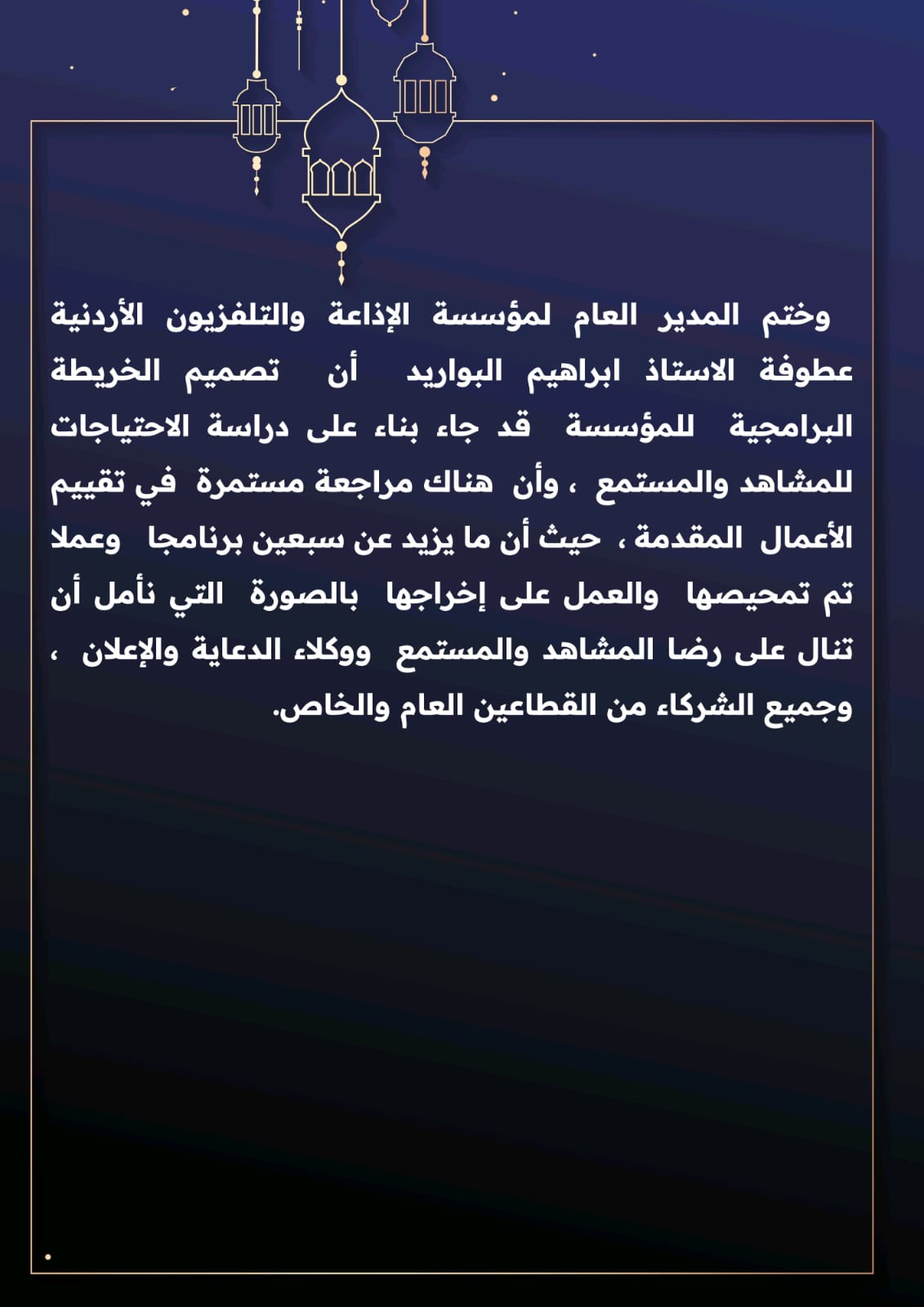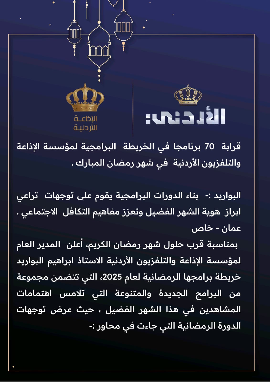 بمناسبة قرب حلول شهر رمضان الكريم، أعلن المدير العام لمؤسسة الإذاعة والتلفزيون الأردنية الاستاذ ابراهيم البواريد خريطة برامجها الرمضانية لعام 2025، التي تتضمن مجموعة من البرامج الجديدة والمتنوعة التي تلامس اهتمامات المشاهدين في هذا الشهر الفضيل ، حيث عرض توجهات الدورة الرمضانية التي جاءت في محاور :- ابراز هوية الشهر الفضيل ، تعزيز التكافل الاجتماعي ، دعم الإنتاج والابداع المحلي ، تلبية احتياجات الأسرة الأردنية بجميع فئاتها، والتفاعل مع الجمهور عبر الشاشة والاثير ومنصات المؤسسة المختلفة