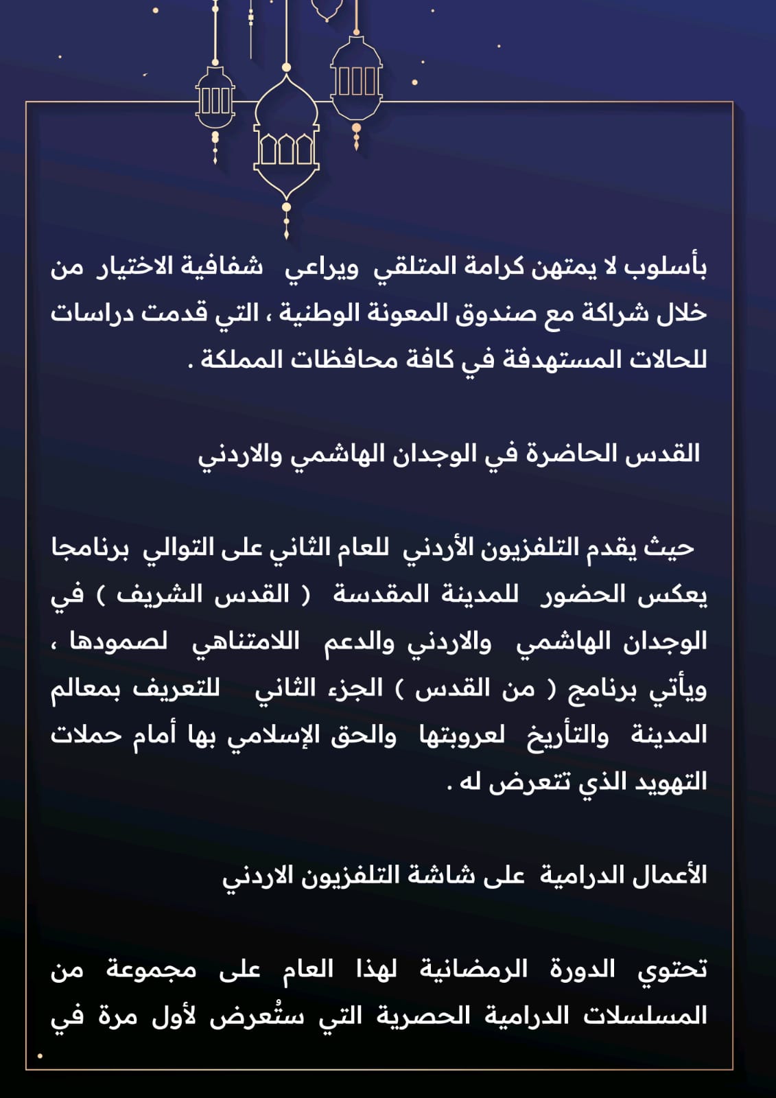 حيث يقدم التلفزيون الأردني للعام الثاني على التوالي برنامجا يعكس الحضور للمدينة المقدسة ( القدس الشريف ) في الوجدان الهاشمي والاردني والدعم اللامتناهي لصمودها ، ويأتي برنامج ( من القدس ) الجزء الثاني للتعريف بمعالم المدينة والتأريخ لعروبتها والحق الإسلامي بها أمام حملات التهويد الذي تتعرض له .