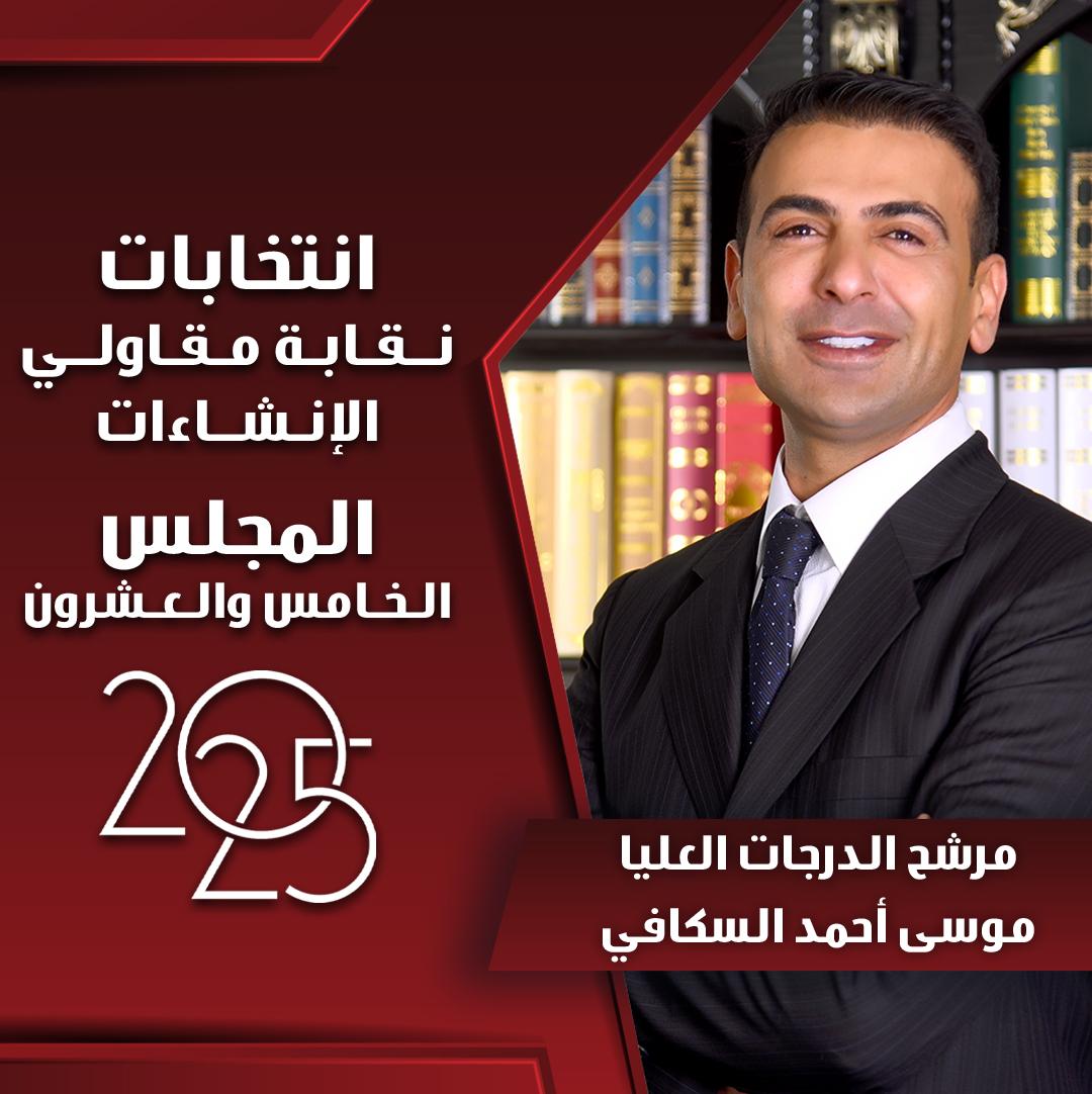 أعلن الشاب الأردني الطموح موسى أحمد السكافي عن خوضه انتخابات نقابة مقاولي الإنشاءات الأردنيين، مرشحًا مستقلًا عن مقعد الفئات العليا، مؤكدًا أن قراره جاء بعد دراسة متأنية واستشارة زملائه من الهيئة العامة، وإيمانًا منه بضرورة النهوض بقطاع المقاولات لمواجهة التحديات التي تعترضه.