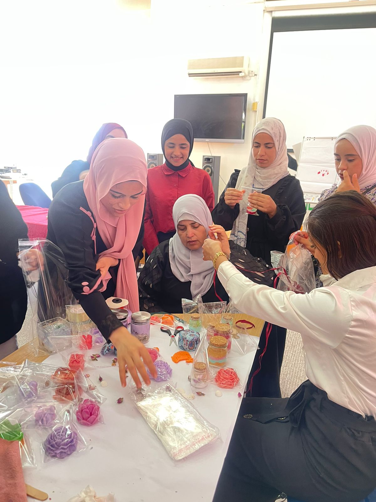 قامت المدربة صباح الحسين بتدريب المشاركات على كيفية صب وتشكيل الشموع في قوالب مختلفة