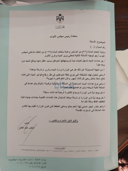 وجّه النائب الدكتور هايل عياش، استنادًا لأحكام المادة (96) من الدستور والمادة (123) من النظام الداخلي لمجلس النواب، مجموعة من الأسئلة النيابية إلى وزير المياه والري، تتعلق بمسألة عدادات المياه وآلية تسجيلها للاستهلاكات.