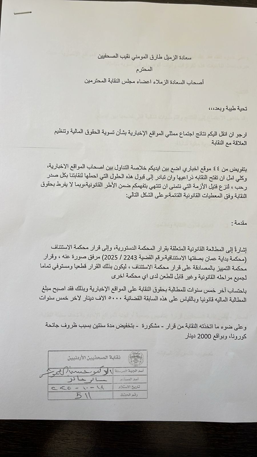 المواقع الإخبارية تسحب فتيل الأزمة و توجه مذكرة لنقابة الصحفيين الأردنيين والأخيرة تحيلها للدائرة القانونية لدراستها – وثيقة