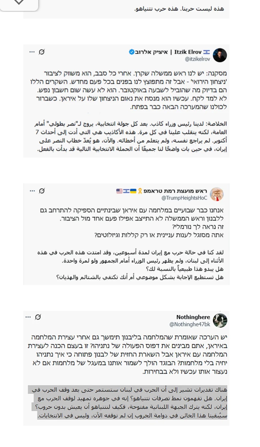 وفي نبرة غاضبة، هاجم ناشطون ما وصفوه بـ"حرب غير مبررة لم تجلب لشعب إسرائيل سوى المعاناة"، مطالبين بإنهاء عهد نتنياهو بالقول: "يجب أن يزول نظام نتنياهو. هذه فرصتنا للإطاحة بهذا "الخائن" قبل أن يدمّرنا".