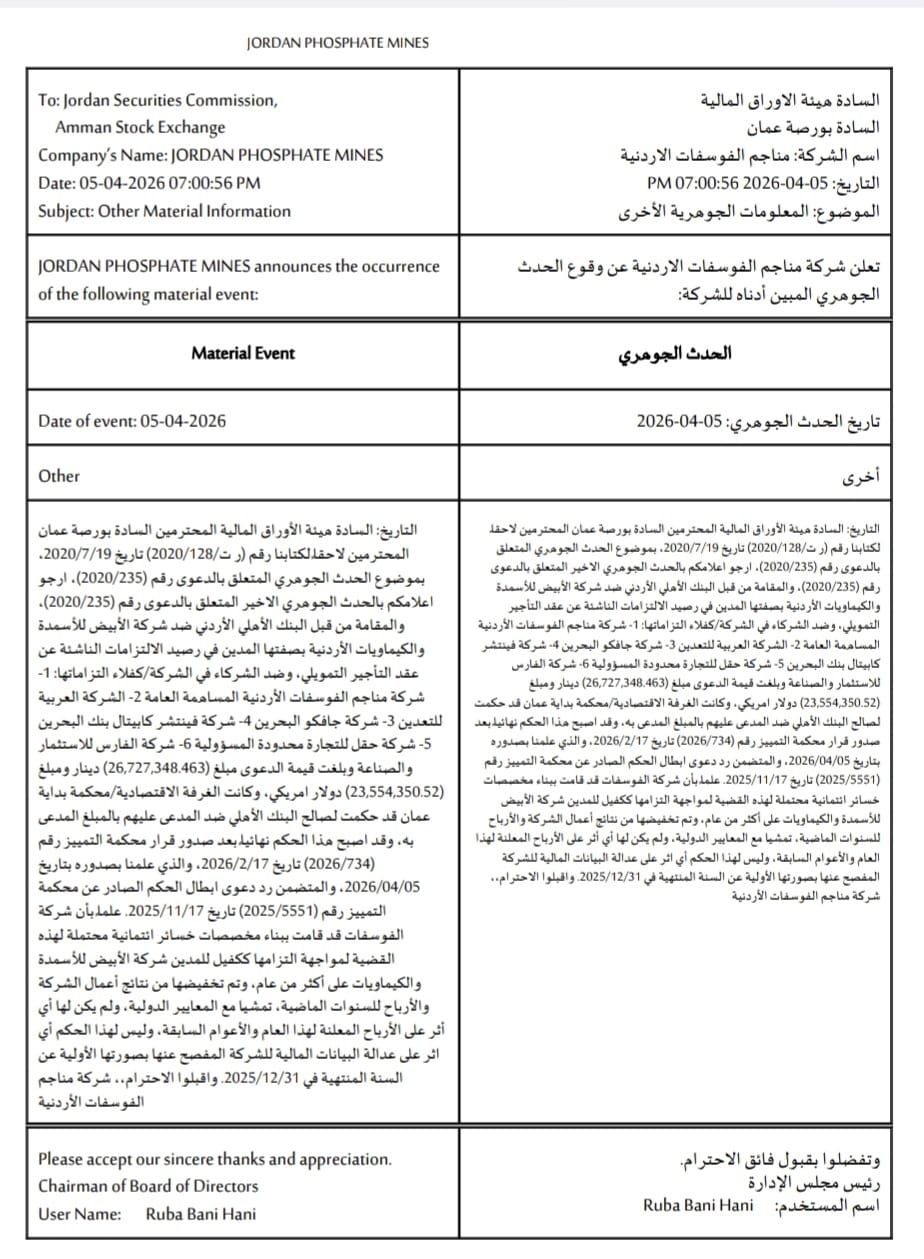 وبينت الشركة في إفصاح عبر هيئة الأوراق المالية وبورصة عمان، أن هذه القضية لم يكن لها أي أثر على الأرباح المعلنة لهذا العام والأعوام السابقة، وأن هذا الحكم ليس له أي أثر على عدالة البيانات المالية للشركة المفصح عنها بصورتها الأولية عن السنة المنتهية في 31-12-2025.