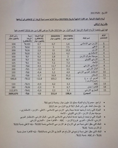 فيما يلي ملخصا لأرباح البنوك الاردنية للربع الاول من عام2017 مقارنة مع نفس الفترة من عام 2016 المفصح عنها