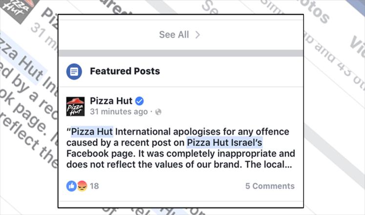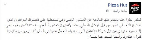 اعتذرت شركة بيتزا هت بمجموعتها العالمية، عن المنشور المسيء في صفحتها على (فيسبوك) إسرائيل، والذي سخرت خلاله من إضراب الأسرى الفلسطينيين عن الطعام.