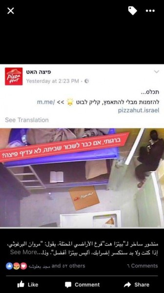 ونشرت صفحة بيتزا هت الناطقة بالعبرية على موقع التواصل الاجتماعي (فيس بوك) صورة من داخل زنازين الأسرى، زعم الاحتلال أنها للقائد الفتحاوي الأسير مروان البرغوثي، وأنه يكسر إضرابه خلسة، ويتناول الطعام، وعلّق المطعم على الصورة: "إذا أردت كسر الإضراب، يفضل أن تطلب بيتزا"، وهو ما حمل إهانةً لنضال الأسرى.