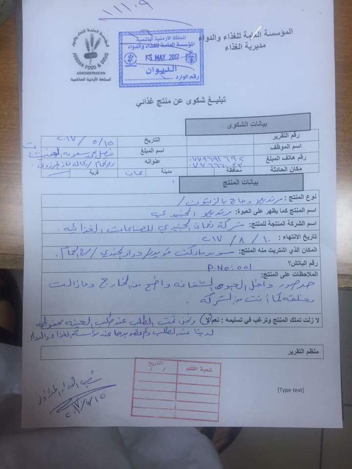 ضبطت كوادر مؤسسة الغذاء والدواء بمنطقة مرج الحمام عبوة "مرتديلا" شركة الجنيدي بداخلها "صرصور" واضح من الخارج وما زالت مغلفة كما اتت من الشركة.