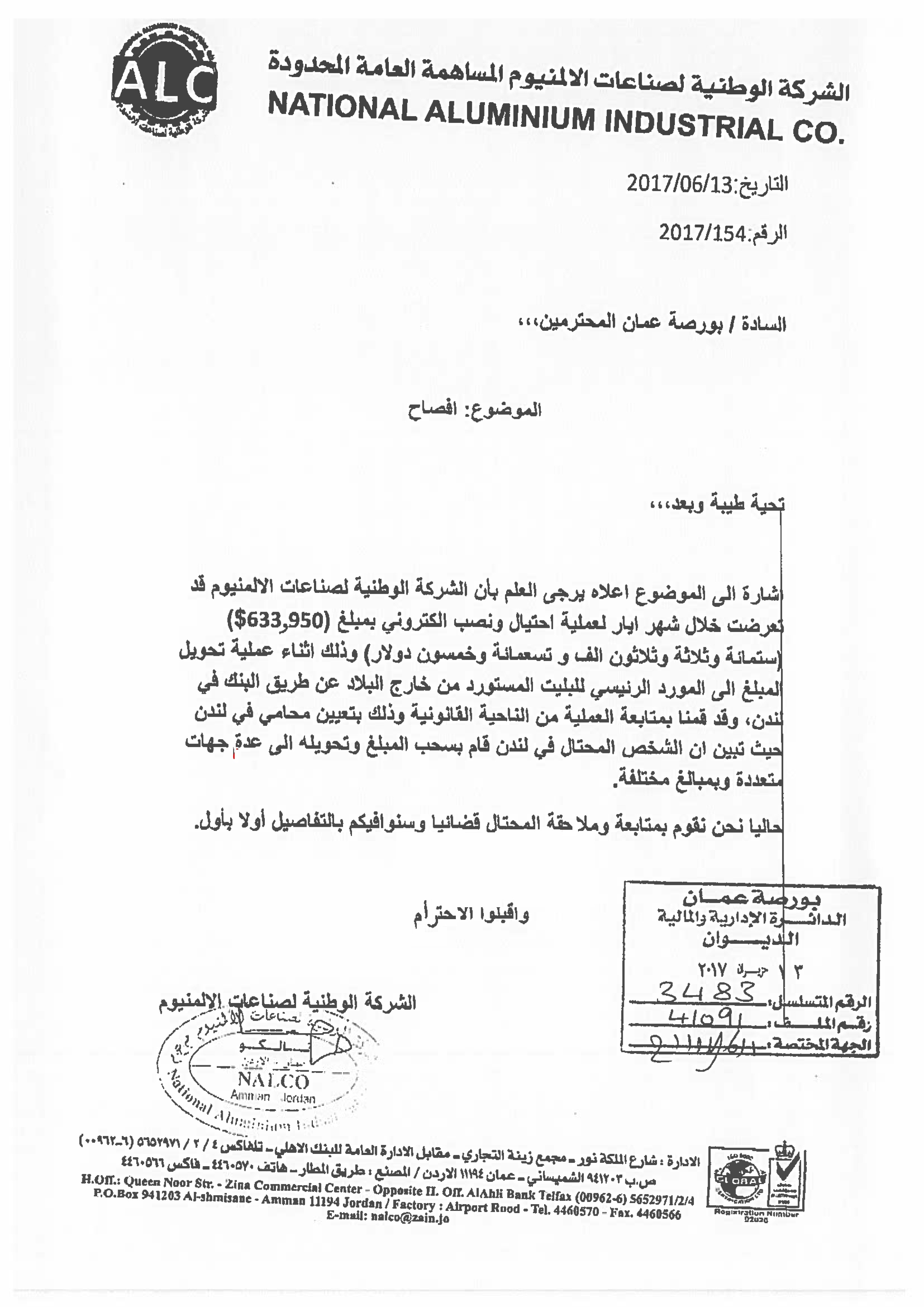 علمت مصادر ان الشركة الوطنية لصناعة الالمنيوم قد تعرضت خلال شهر ايار الى عملية نصب الكتروني بمبلغ (633.950) دولار.
