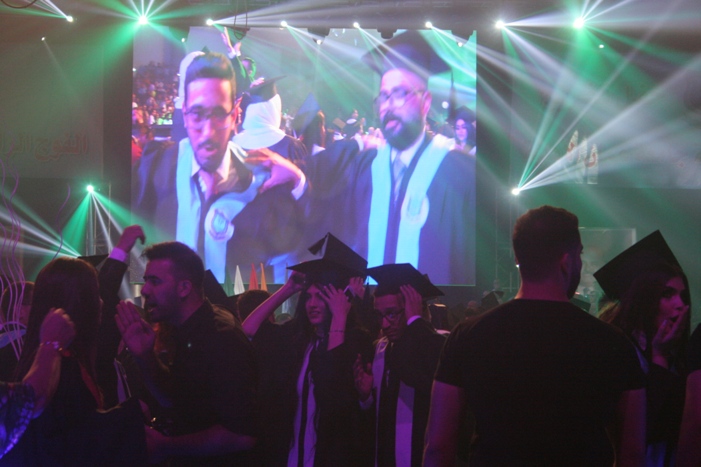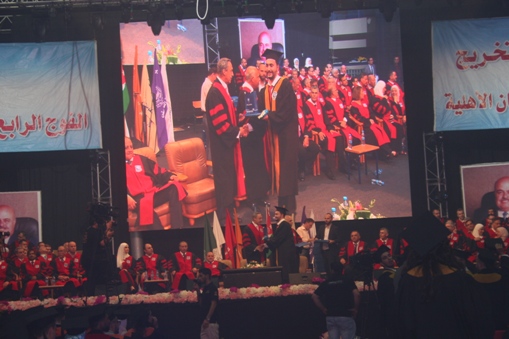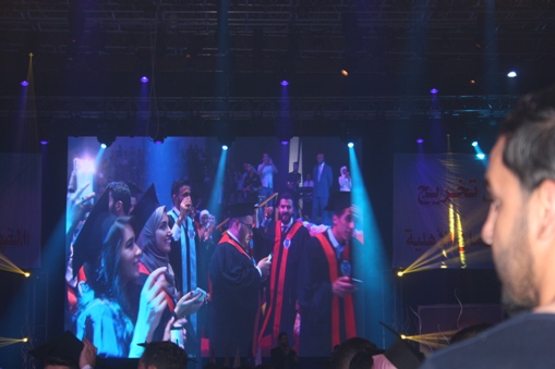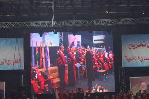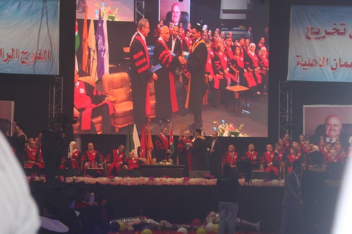 تبع ذلك اعلان اسماء الخريجين والخريجات حيث قام دولة الكباريتي راعي الحفل والى جانبه رئيس الجامعة بتسليم الشهادات للخريجين والخريجات والجوائز التقديرية للمتفوقين والمتفوقات .